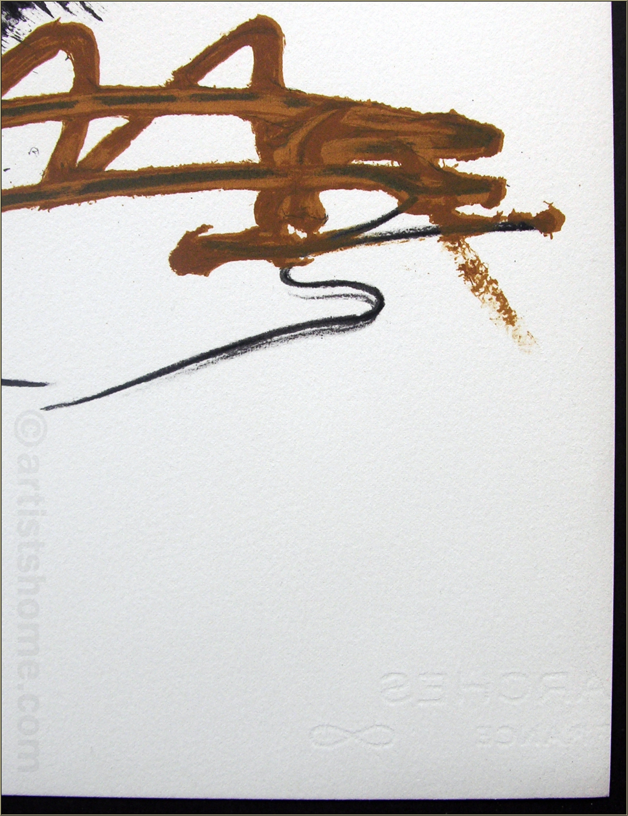 Beside the unsigned edition on Velin paper for Derriere le miroir, 150 impressions were printed on Arches paper with wide margins and signed by Tapies. Here is an unsigned impression with margins slightly cut (please see photo). Rare!