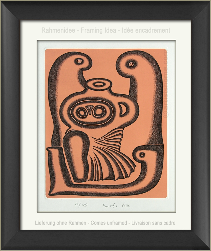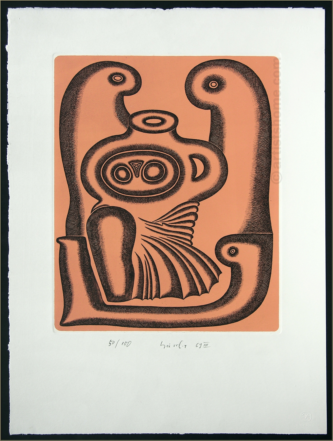 Details:"Figura terracotta" Two people sit opposite each other, eyes locked, behind a strangely shaped, round mug. Below them, a small, lying figure can be seen in the foreground. Countless fine lines create soft contours that can, at the same time, be clearly distinguished from the terracotta-coloured background. The work exhibits harmony as well as formal and mental sober-mindedness, intensified by the warm colour of fired clay.