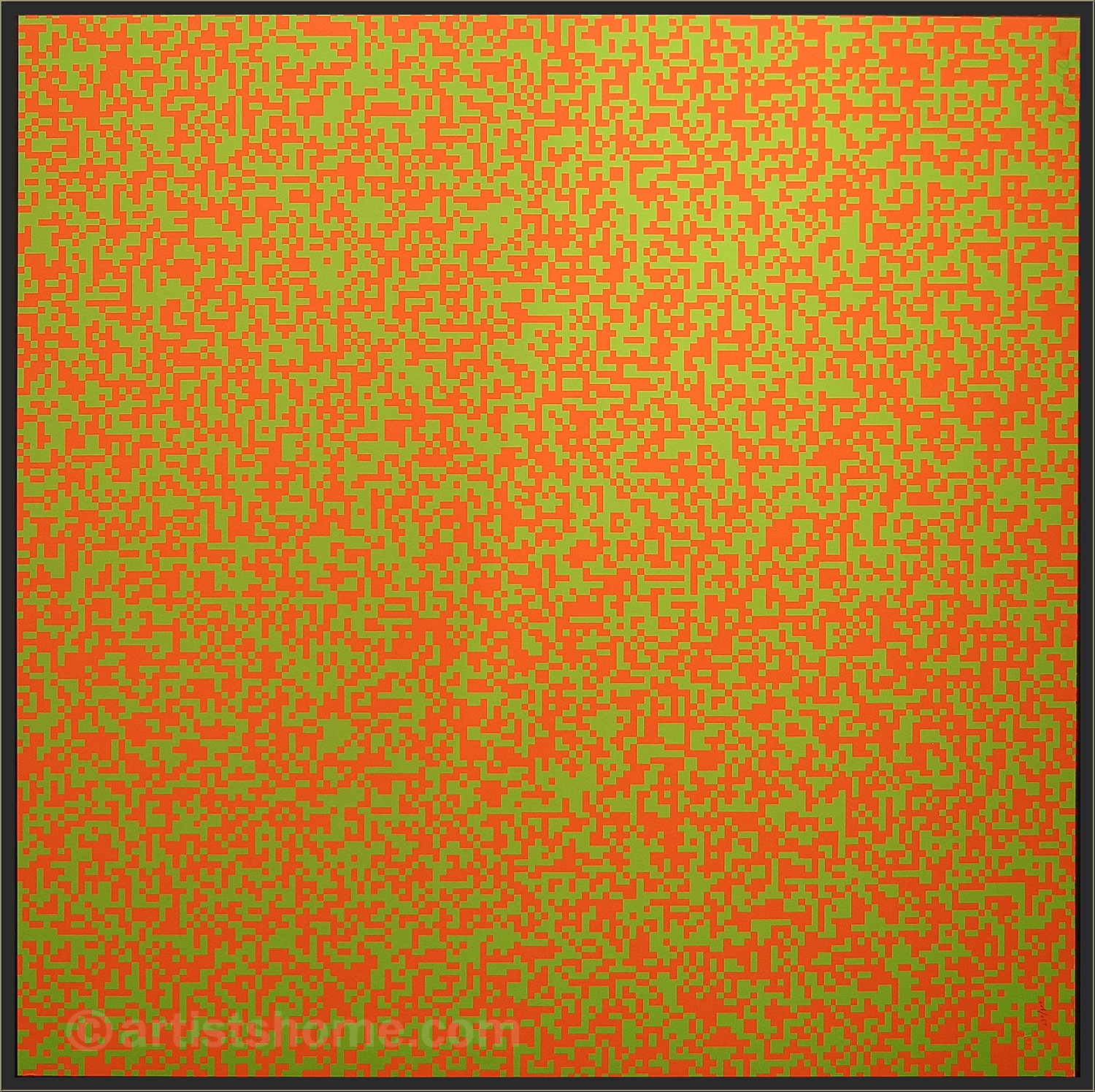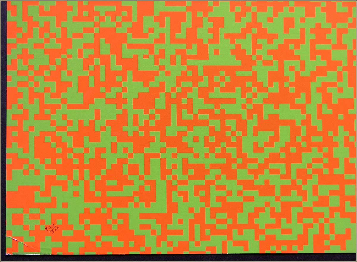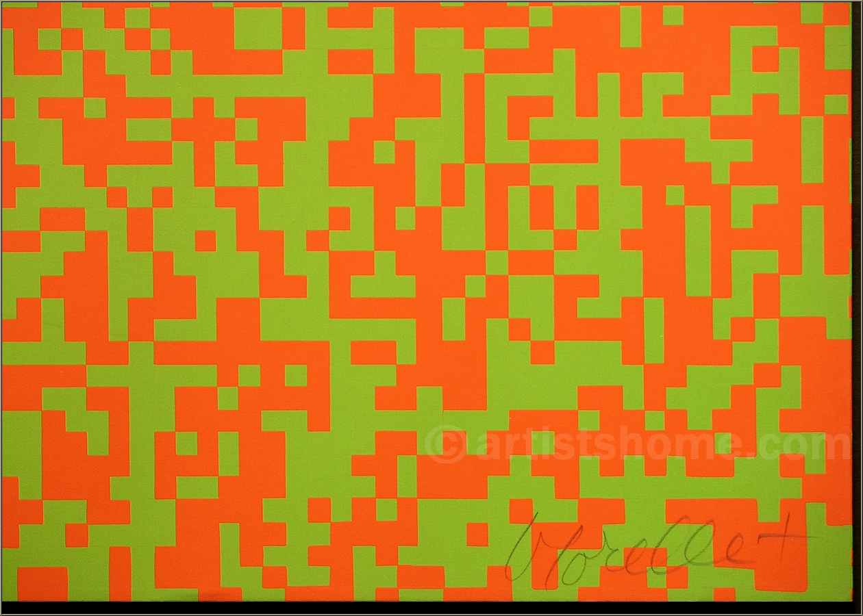 Original silkscreen print (serigraph) with thousands of orange and light green squares, causing a confusing illusion of movement for the human eye due to the dizzying juxtaposition of two colours of similar intensity and luminosity. A signed and numbered copy, published by Denise René, France.
