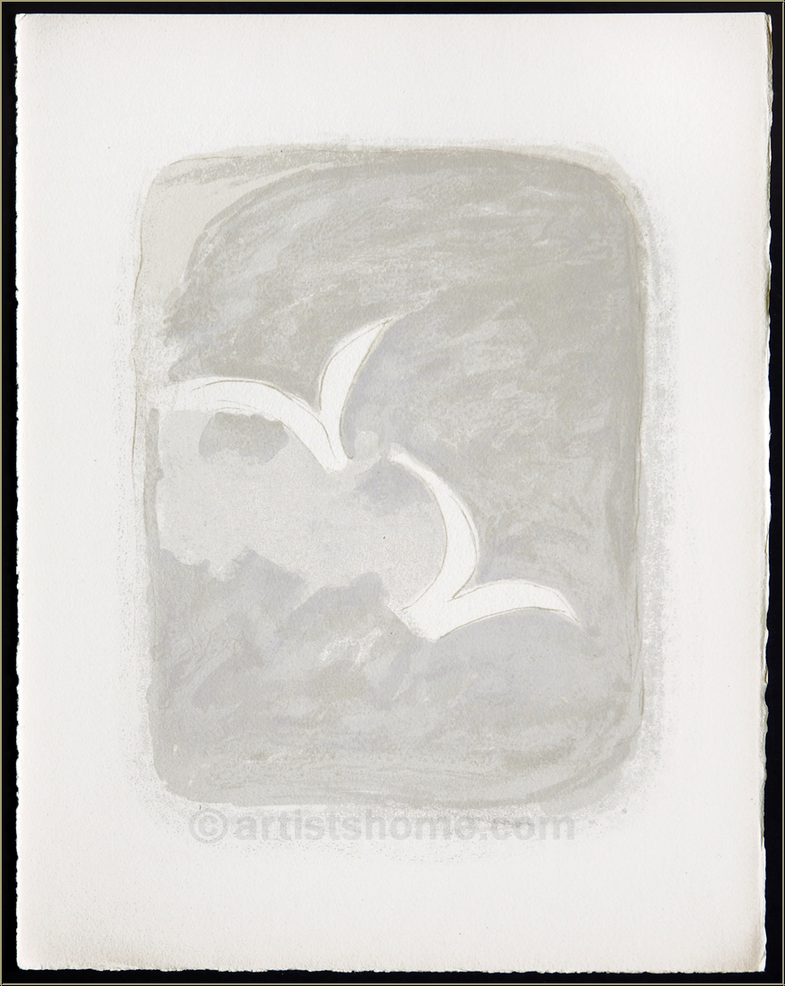 Details:Color lithograph for "Descente aux enfers" (Descent into hell) As the opening motif for Marcel Jouhandeau’s "Descent to Hell", Georges Braque created a very light work consisting of three different shades of grey. A flying bird couple that seems to emerge from far-off mists … Happy to be seeing what is beneath them again. The work seems tender and delicate, and its "colourlessness" makes it seem even more expressive. This is the first of four original colour lithographs that Braque used to illustrate one of his last artists’ books (see title above). All four show flying birds - a subject that became so important to him towards the end of his life that he reinvented it in countless variations.