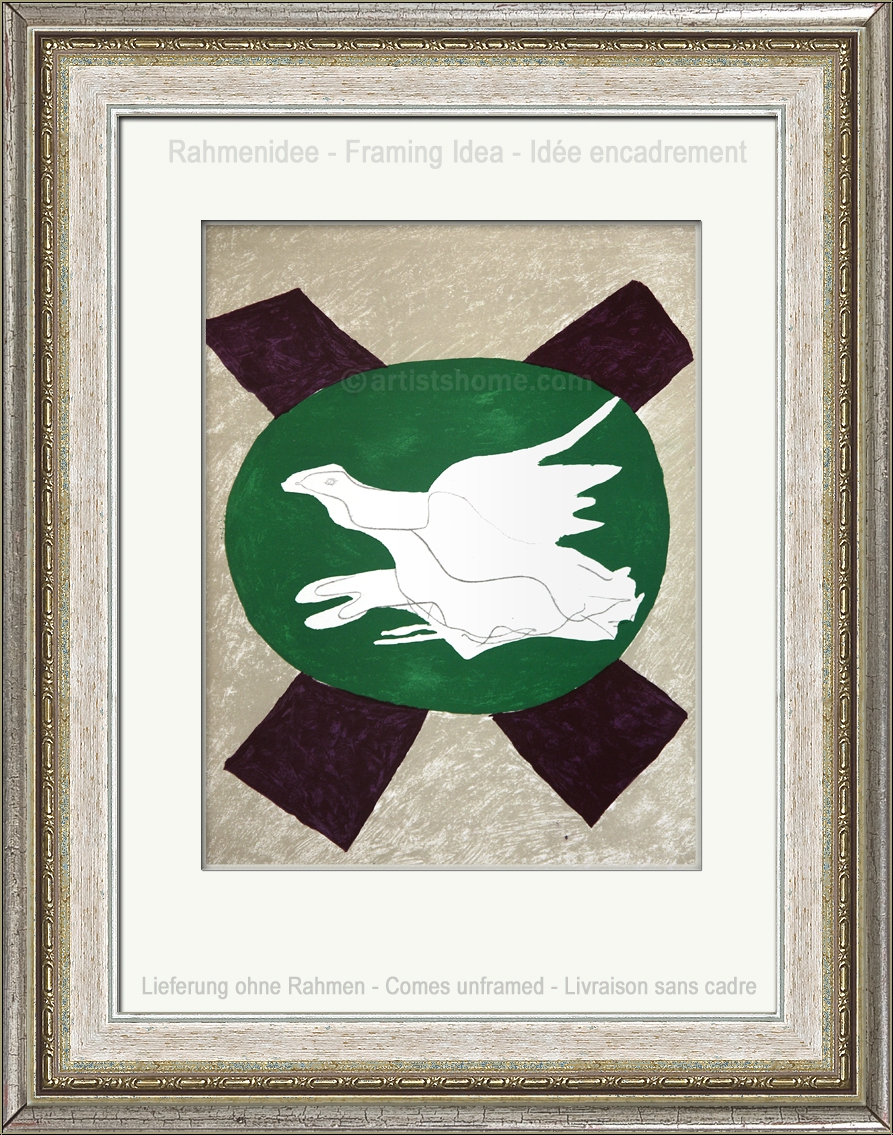 Genuine lithograph in colors (Mourlot 55) Bird on green oval with striking "X"