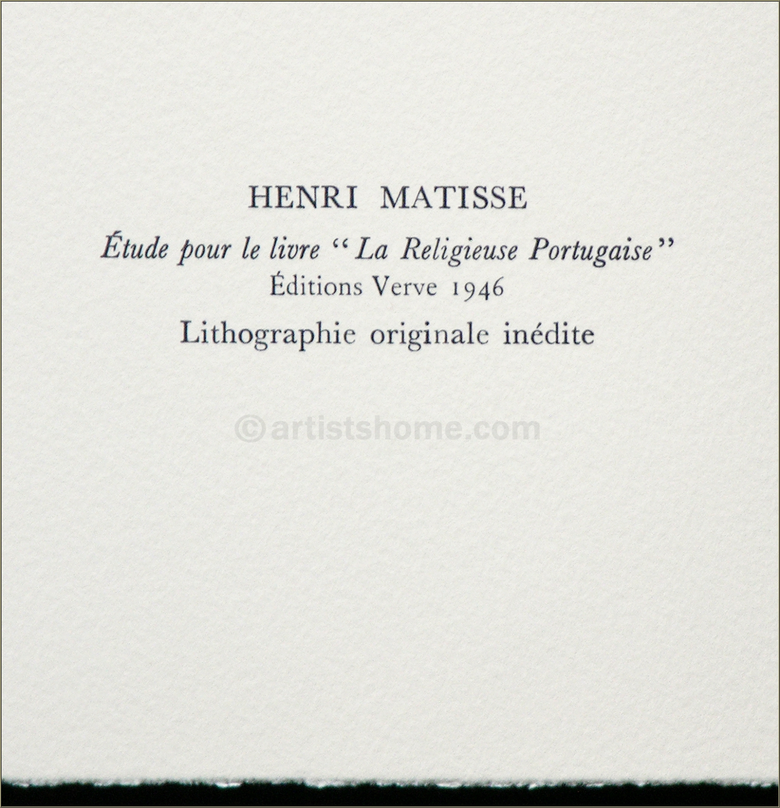 Remarks: Text on the reverse: "Henri Matisse - Étude pour le livre "La Religieuse Portugaise" - Éditions Verve 1946 - Lithographie originale inédite." ("inédite" means unpublished)