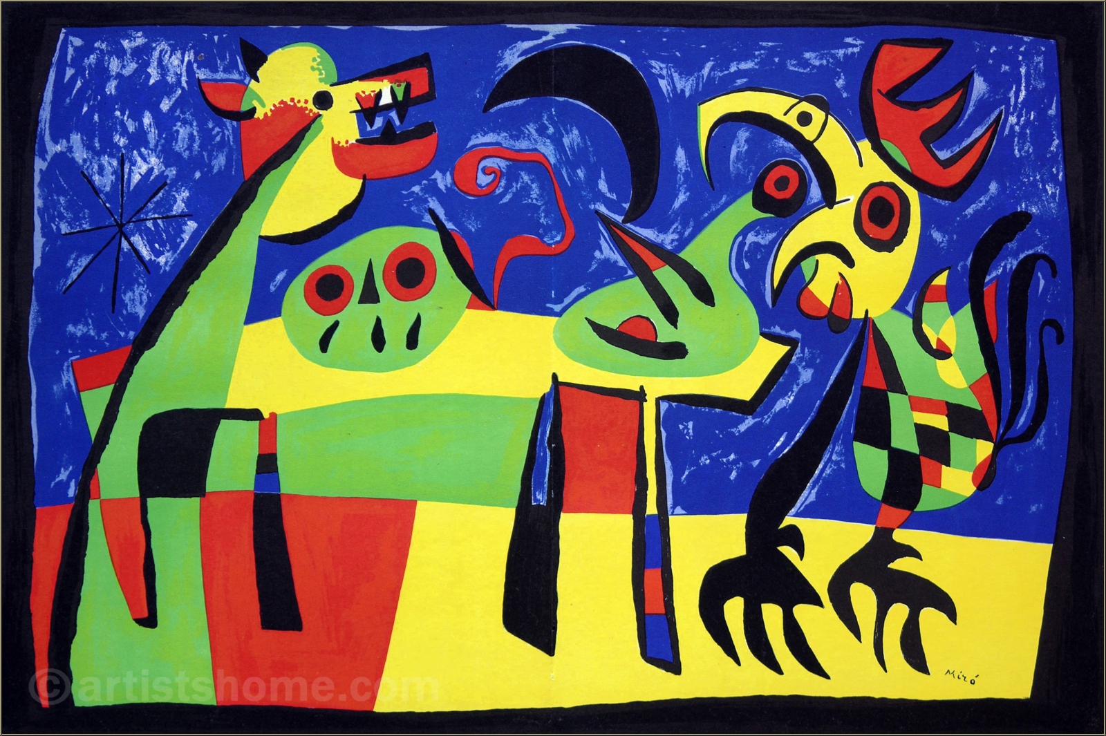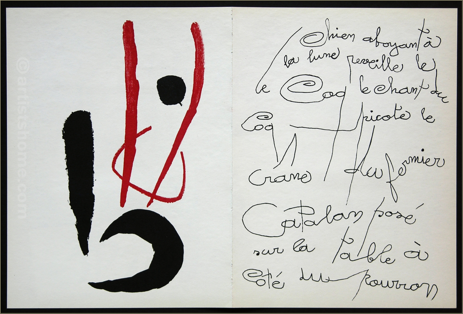 | | | | "Dog barking at the moon" - 1952 Large, early original lithograph in colors by Joan Miro from 1952. This is N O T a mass-produced reprint (e.g. offset lithograph) but the original lithograph from the renowned artist's portfolio Verve Vol. VII, nos. 27 - 28 | Size: | 35,5 x 53 cm (sheet size) | | Edition | Paper: | One of the unsigned impressions for the original Verve edition on smooth velin paper. In addition, 80 impressions were printed on Arches wove paper with wide margins and pencil-signed and numbered by Chagall. | | Published by: | Tériade Editeur, Paris | | Printed by: | Mourlot Frères, Paris | | Remarks: | Signed "Miro" in the plate. Another lithograph on the reverse, see picture 3. With the usual centerfold, as published in 1952. | Documentation/ References: | Leiris, Michel and Mourlot, Fernand. Joan Miró - Der Lithograph I, Maeght, Paris, 1972, page 231, No. 121. Your print is being delivered with an abstract from the a.m. catalogue raisonné for your files. In addition, you'll receive a proof of identity (without selling price in case this print is intended as a present). | | Condition: | Read more A flawless impression from the archives. Rare, in this condition! Frame not included in delivery. | | | Customer Reviews: ( 2) 5/5 Customer reviews at original-prints.com:Each consumer review is verified for authenticity prior to publication, ensuring that reviews come only from consumers who have actually purchased the products being reviewed. This verification is done a) by sending individualized links after completing an online order that lead to an online rating form and ensure that access to the rating function is only granted to consumers who have actually purchased a product, or b) by making the possibility of submitting a rating dependent on a prior login to the registered customer account from which a purchase was made. 5 1 5 18/07/2015 - Mr Peter L., Taiwan 2015-07-18 2015-07-18 10/09/2013 - Andrew F., United States 2013-09-10 2013-09-10 Customer ratings may only be submitted by customers who have bought this item and are logged in. Your name will, of course, be displayed anonymized (e.g., "Tom H., United Kingdom").  *Applies to deliveries to Germany paid via PayPal. In case of payment by bank transfer, delivery will take 1-3 days longer from the day of your banker�s order. Delivery times for other countries and information for estimating the day of delivery can be found here |