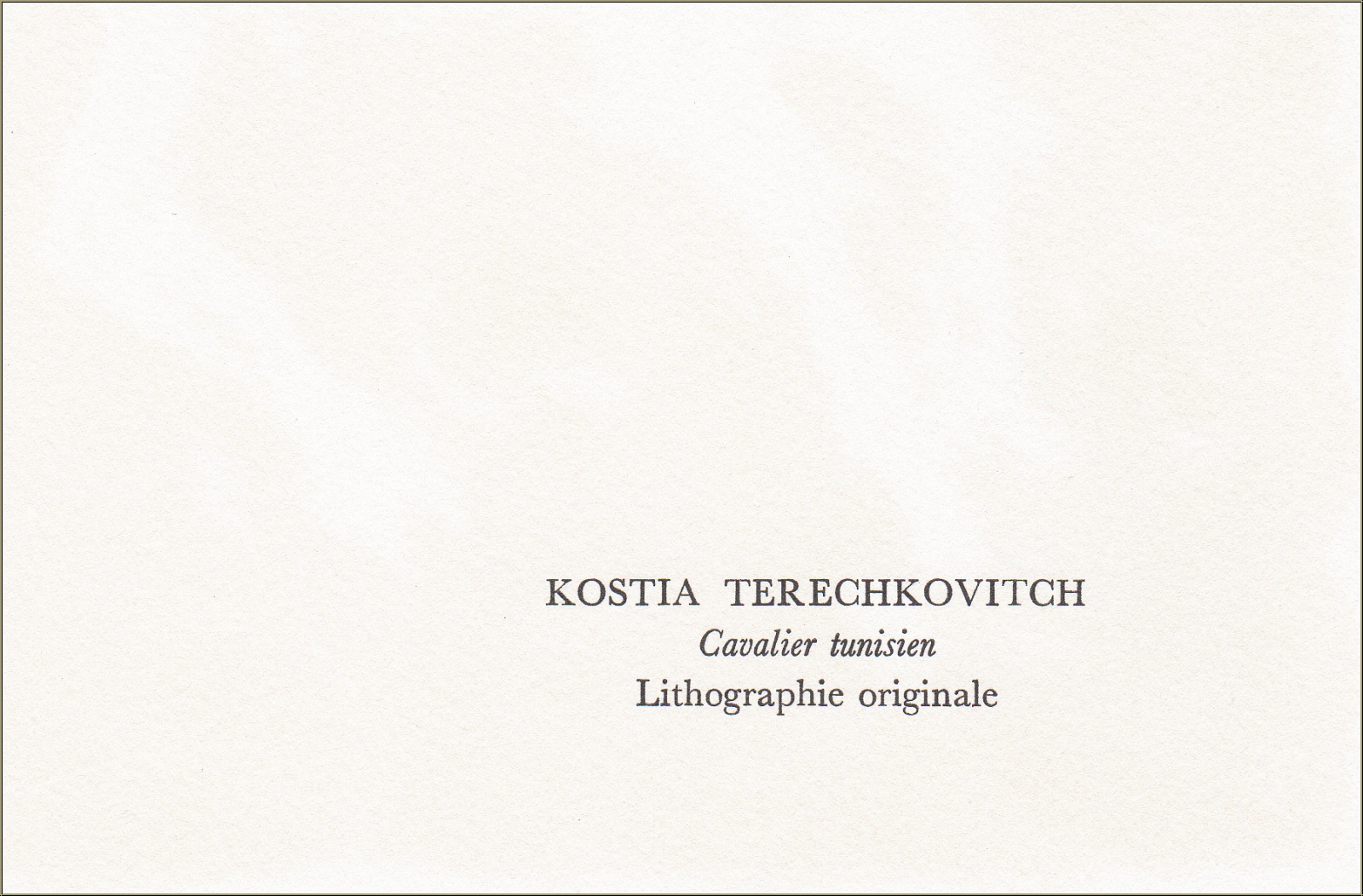 | | | | "Cavalier tunisien" Original lithograph on Arches wove paper by Kostia Terechkovitch for Fernand Mourlot's renowned portfolio "Souvenirs et portraits d'artistes". This is N O T a mass-produced art print (e.g. offset or grano lithograph from a later "Limited edition") but the original lithograph from the collector's de luxe edition of the a.m. portfolio. | Edition: | One of 800 unsigned impressions on Arches laid paper. | | Size: | 32,5 x 25 cm (sheet size) | | Published by: | Alain C. Mazo, Paris and Léon Amiel, New York, 1972 | | Printed by: | Mourlot, Paris | | Remarks: | Text on the reverse: "Kostia Terechkovitch - Cavalier tunisien - Lithographie originale" | Documentation/ References: | https://mourlot.com: "Livres de Fernand Mourlot" (in French language) | | Condition: | Read more In fine condition. Comes unframed. | | | | Customer Reviews: This item has not been rated, yet. Customer ratings may only be submitted by customers who have bought this item and are logged in. Your name will, of course, be displayed anonymized (e.g., "Tom H., United Kingdom").  *Applies to deliveries to Germany paid via PayPal. In case of payment by bank transfer, delivery will take 1-3 days longer from the day of your banker�s order. Delivery times for other countries and information for estimating the day of delivery can be found here |