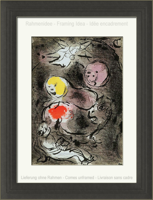 In 1956, the French art critic and publisher Tériade brought out a special issue of the legendary art magazine Revue Verve, which was exclusively devoted to one of Marc Chagalls major themes: The Bible. For this outstanding issue, Chagall composed 18 full-page colour lithographs and 12 in black and white. For his "Bible I" Marc Chagall focused on characters from the Old Testament such as the Founding Fathers, the Kings, the Prophets and Angels. Four years later, in 1960, the follow-up issue "Illustrations for The Bible" was published, with another 24 gorgeous color lithographs. Since then, vast numbers of reproductions were put in circulation which are anything but original lithographs.