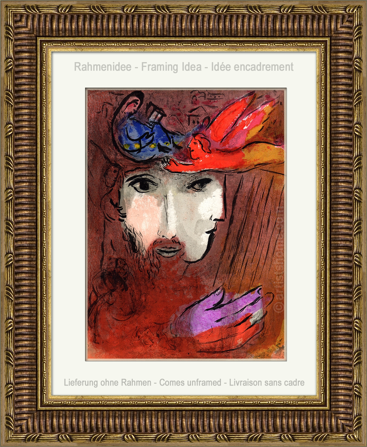Apart from his themes of prophets, angels and the story of Moses, in his first bible cycle, Chagall also addressed the theme of kings. The by far most popular and most loved lithograph from the two bible cycles shows the faces of two lovers, David and Bathsheba, blended into one face – an allegory for the two sides dwelling in everything: The hard and the soft, the good and the bad, the masculine and the feminine side.