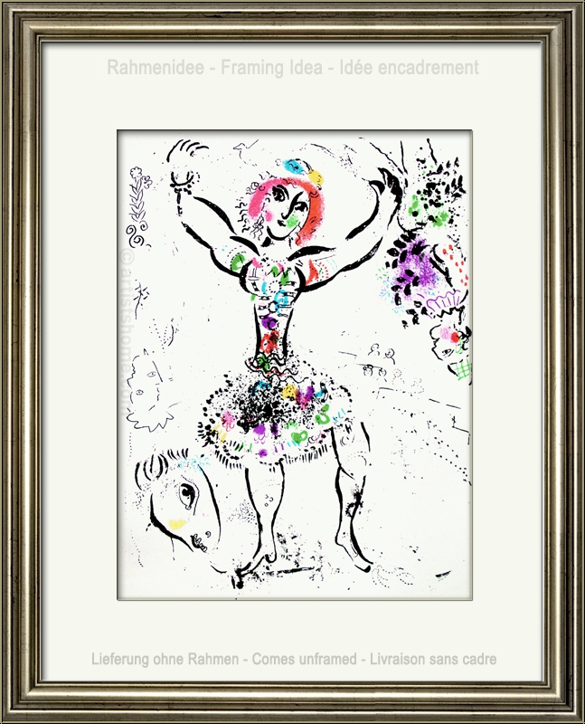 As in many of his lithographs, Chagall accompanies the spectacle that can be seen here with organic forms such as flowers and twigs. This is done with a lightness that closely resembles the elated play of the juggler. He repeatedly creates a harmony between animal and human being. Deep black lines are contrasted with soft colours. The genius painter provided the scene with the right degree of joy and dynamics by his use of individual, colour-rich brushstrokes in magenta, green, purple, yellow and blue. It is a visual spectacle one never grows tired of looking at. The upside-down harlequin on the right embodies the crazy world of the circus that Chagall loved during his whole lifetime.