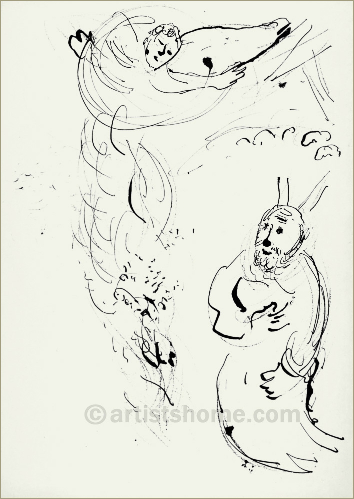 In 1956, the French art critic and publisher Tériade brought out a special issue of the legendary art magazine Verve, which was exclusively devoted to one of Marc Chagalls major themes: The Bible. For this outstanding issue, Chagall composed 18 full-page colour lithographs and 12 in black and white. For his "Bible I" Marc Chagall focused on characters from the Old Testament such as the Founding Fathers, the Kings, the Prophets and Angels. Four years later, in 1960, the follow-up issue "Illustrations for The Bible" was published, with another 24 gorgeous color lithographs. Since then, vast numbers of reproductions were put in circulation which are anything but original(!) lithographs.*