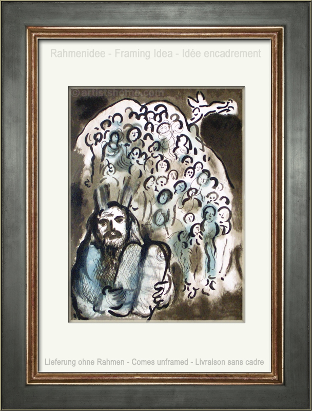 | | Moses and His People - Frontispiece for "The Biblical Message" | Technique: | Original lithograph in colors (Mourlot 689) This is N O T a mass-produced reprint (photomechanical reproduction) but the original lithograph from the year 1973, exactly as referenced in Mourlot's catalogue raisonné. | | Year: | 1973 | | Sizes: | 32 x 24 cm / 12 ½ x 9 ½ inch. (sheet) | | Edition | Paper: | One of 10000 unsigned copies on wove paper. In addition, 50 pencil-signed and numbered copies on Arches wove paper with wide margins were published. | | Remarks: | Acknowledgments to the Musée National Message Biblique Marc Chagall in Nice and to Charles Sorlier for their contribution printed on the reverse. | | Published by: | Fernand Mourlot, Paris and Weber, Geneva | | Printed by: | Mourlot Frères, Paris | | Documentation / References: | Mourlot, Fernand. Chagall Lithograph [IV] 1969-1973, André Sauret, Monte Carlo 1974, pages 152-153, No. 689 Your print is being delivered with an abstract from the a.m. catalogue raisonné for your files. In addition, you'll receive a proof of identity (without selling price) in case this print is intended as a present. | | Condition: | Read more In excellent, untouched condition with strong, unfaded colors. Frame not included in delivery. | Customer Reviews: This item has not been rated, yet. Customer ratings may only be submitted by customers who have bought this item and are logged in. Your name will, of course, be displayed anonymized (e.g., "Tom H., United Kingdom").  *Applies to deliveries to Germany paid via PayPal. In case of payment by bank transfer, delivery will take 1-3 days longer from the day of your banker�s order. Delivery times for other countries and information for estimating the day of delivery can be found here |