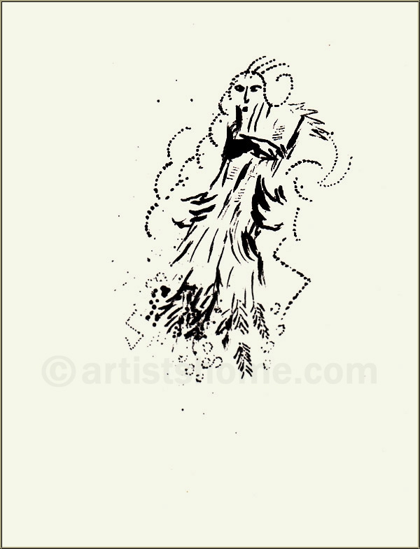 Marc Chagall dedicated a sequence of five lithographs to the chapter of Ruth. This one is the first on the woman who became Boaz’ wife and consequently King David’s primordial mother through love, faithfulness and consistency.