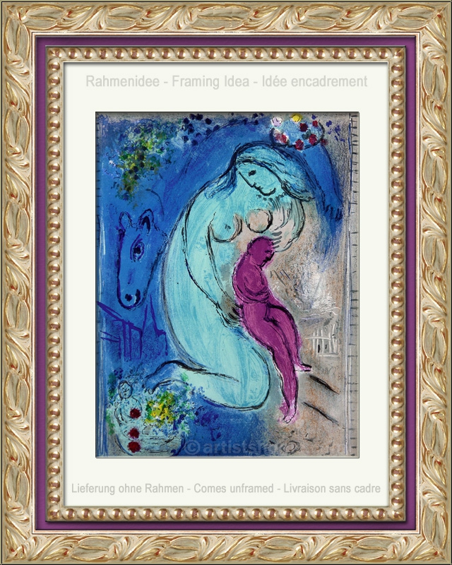 In this limited edition print, Chagall united spatially separated objects in one painting as he often did in his compositions. He changed scales as he deemed appropriate and placed the protagonist’s head backwards onto her body. Everything in this lithograph seems to be floating, even the cathedral (is it Notre Dame?), and the familiar animal Chagall often painted, amplified by the intensive blue of the sky over Paris. The flower-bedecked arm protruding from nowhere, possibly protecting the odd couple, however, remains a secret. In this great graphic, Chagall especially graduated light pastel shades so that they appear to be colourised by hand.