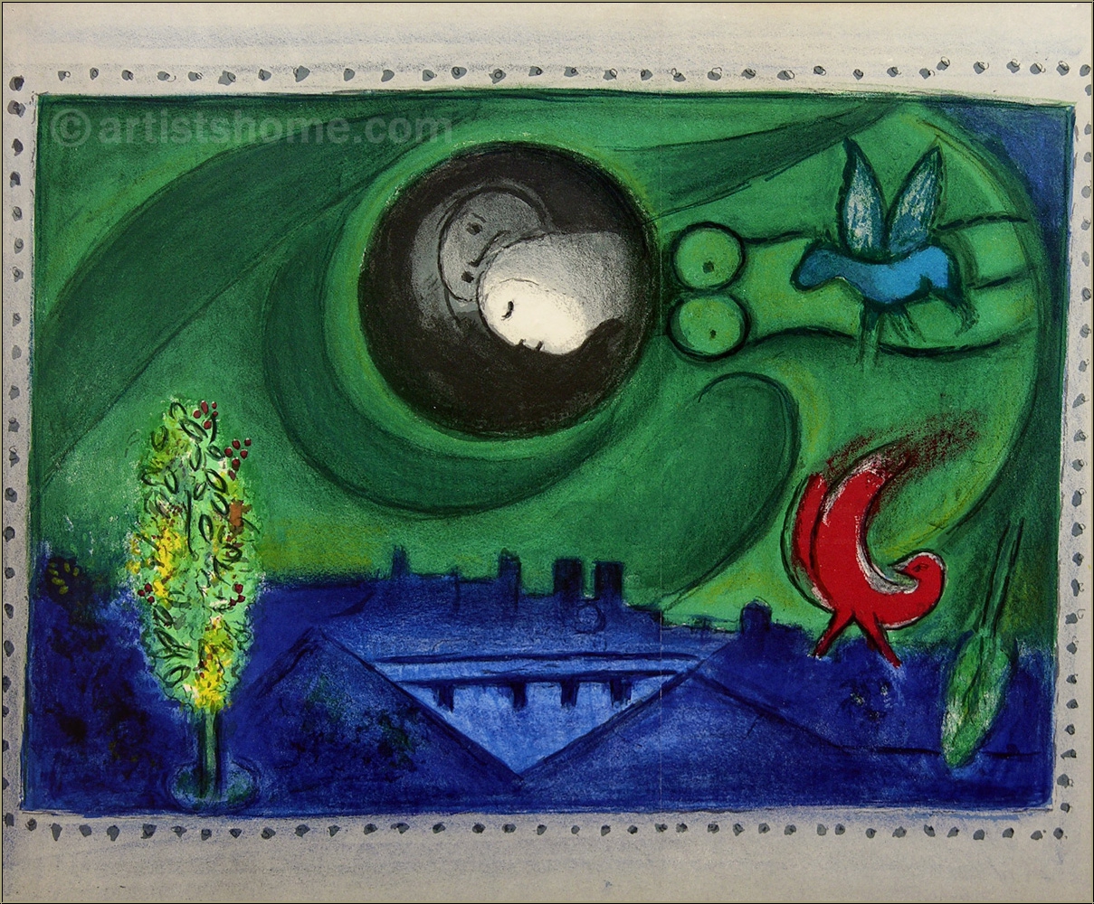 This is N O T a mass-produced reprint (photomechanical reproduction such as offset lithographs or giclée prints) but the original lithograph from Chagall's "Paris" book, exactly as referenced in Mourlots catalogue raisonné.