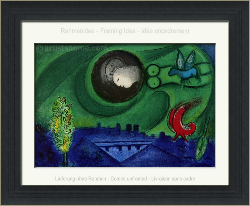 According to the graphic works catalogue, Chagall began his cycle on Paris with this large-sized lithograph, which does not show any of the well-known Paris sights, but only one of the many jetties along the river Seine. Why was this place so important for Chagall? The graphic gives the answer: Apparently, this was where he could visualise his nostalgia and longing for his family. The melancholy of his choice of colours and the symbolism of this piece speaks for itself, while the quay becomes a 'secondary battlefield'. And Chagall's characteristic graphic symbols are back: his donkey-like animal, this time winged in order to become airborne. The tree directing him to his roots, and the intimate, and seemingly earnest lovers.