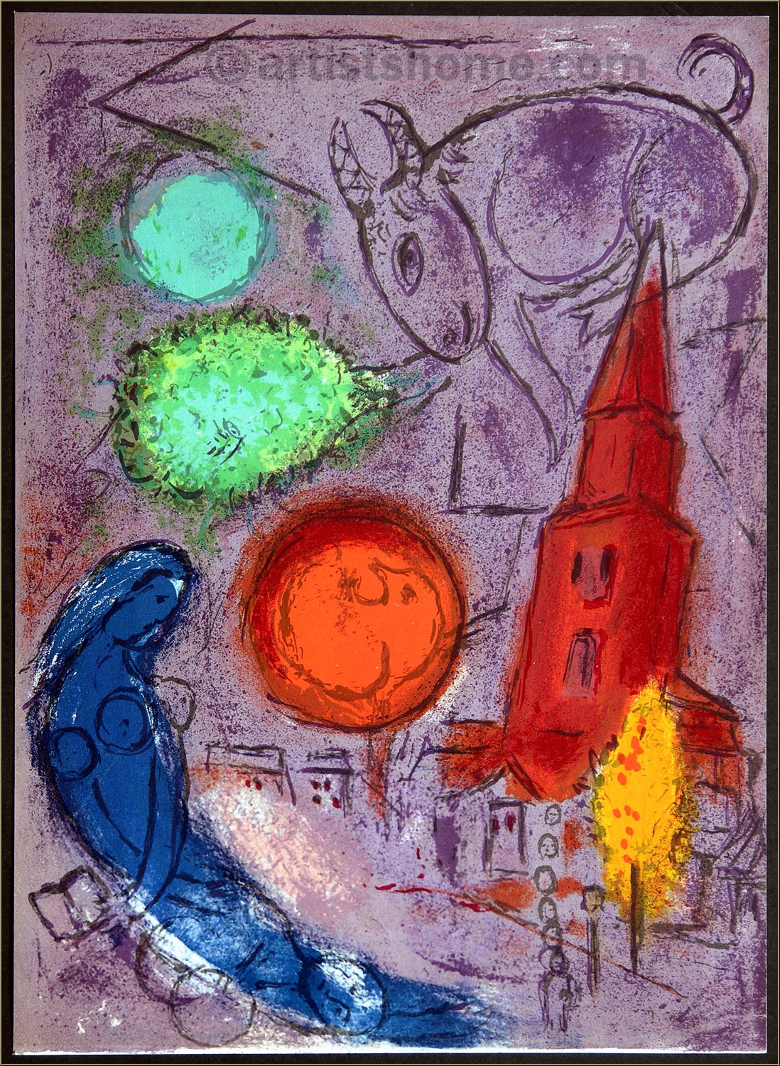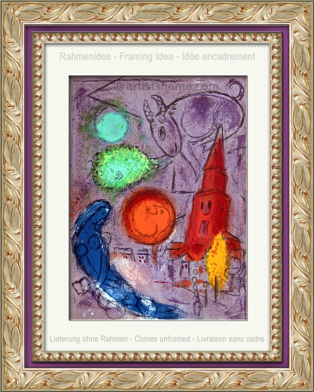 Details:"Saint-Germain-des-Prés" When he was asked about why he left his Russian home country, Chagall used to say "I needed Paris for my artwork as desperately as a tree needs water". He seemed to have experienced the silence, melancholy and colourlessness of Liosno, Witebsk, and also of his family environment at the time, as suffocating. Paris became Chagall’s home away from home, and the Bohemian neighbourhood of Saint-Germain-des-Pres, the 6th arrondissement of Paris just next to the Latin Quarter, probably embodied the freedom he had long been awaiting. This painting reflects the neighbourhood’s colourful versatility, and is emphasised by his remarkable choice of colours: Who else but Chagall could have come up with the idea of combining a subdued purple with a bright orange and turquoise?