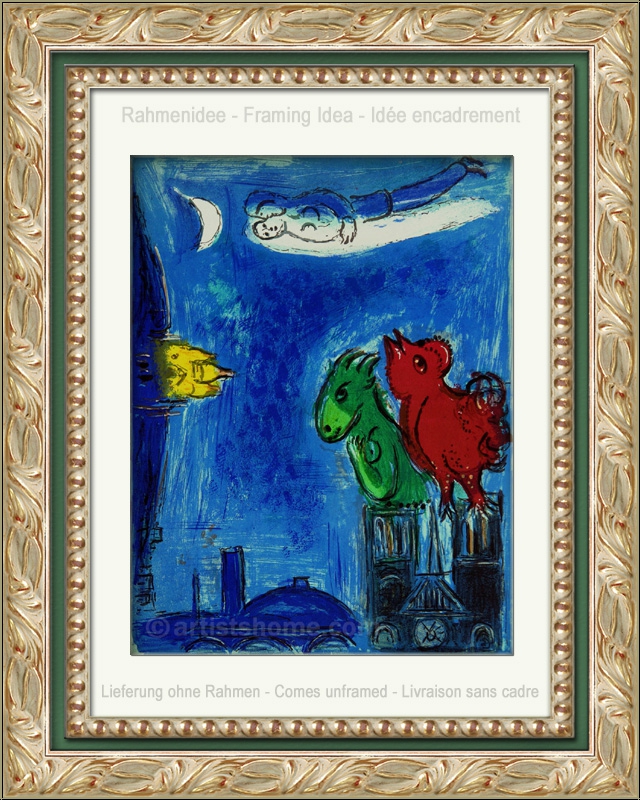 Details:"Les Monstres de Notre-Dame" Just as the hunchback of Notre Dame was not a monster, Chagall's animals were never monsters, either. Chagall must have named this lithograph with a smile on his face. Even though his little 'monsters' appear over-sized on top of the Notre Dame cathedral, the cock in the picture looks rather longingly to the lovers floating above it, while the female donkey seems to struggle having to decide between Sacre Coeur and the pantheon. It is a peaceful scene of the Paris twilight, and a splendid graphic to the story of the hunchback of Notre Dame and Esmeralda. The composition and choice of colours are typical for Chagall's art.