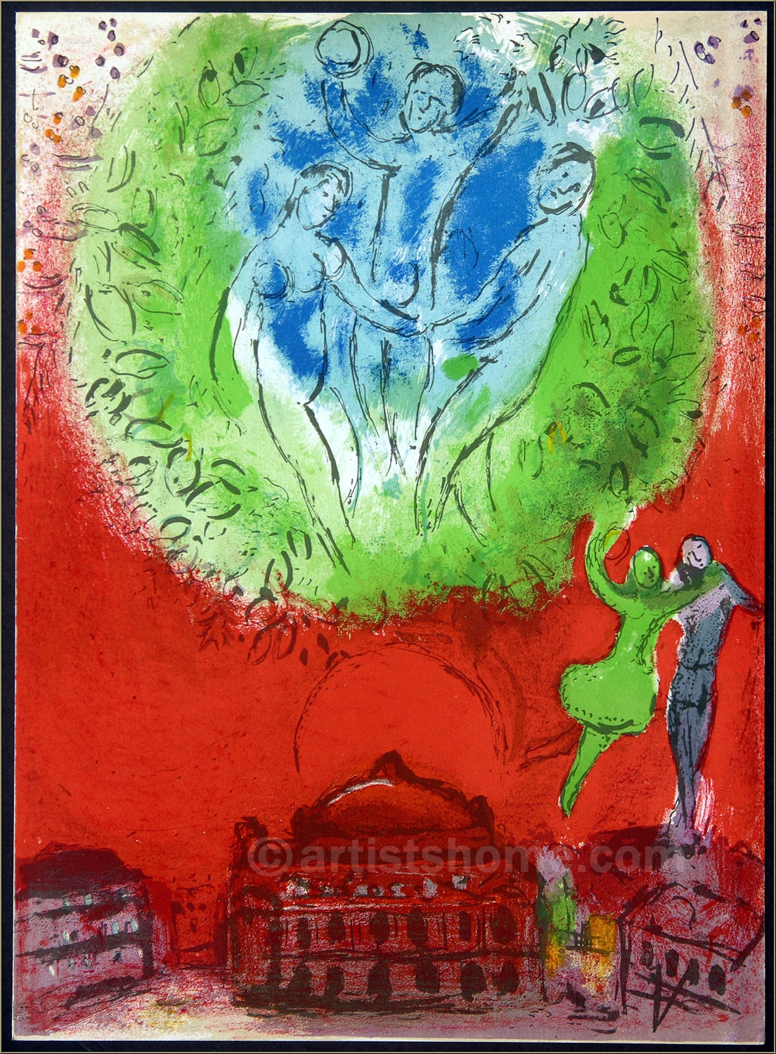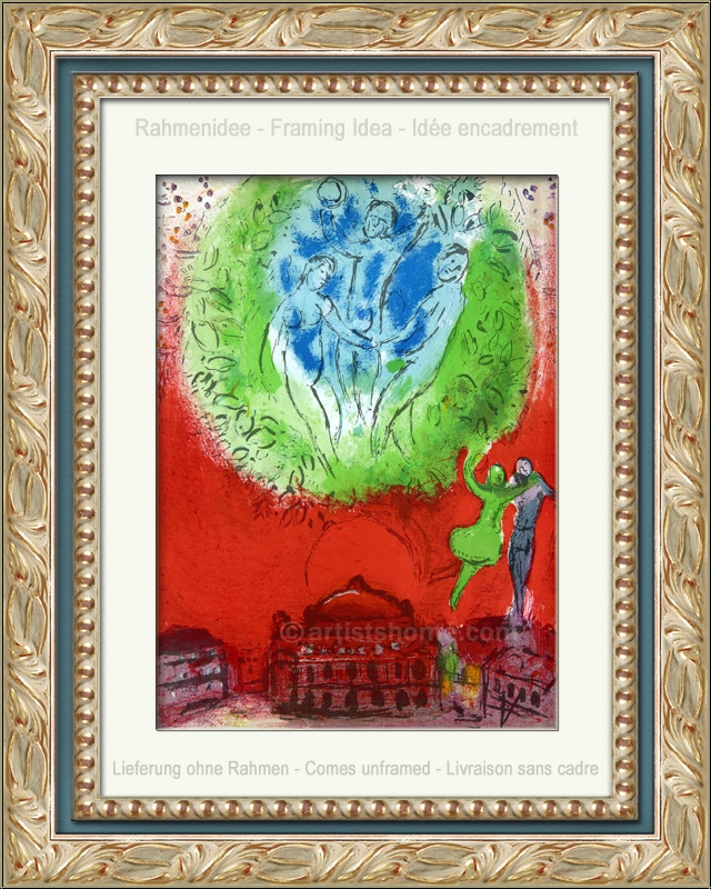 | | The Paris Opera House ("L'Opéra de Paris") Marc Chagall expressed his overwhelming zest for colours, light-heartedness and joie de vivre in his splendid graphics like "The Paris Opera House". "L'Opera" is surely one of his most colourful lithographs, depicting a couple dancing over the roofs of Paris, and including an act of a (fictitious?) opera illustrated in may green and pale blue. The fact that he later painted the famous ceiling for the venerable opera house demonstrates his ties to the performing arts, but also to this impressive building as in all his paintings he used intensive, lucent shades of red for it. | Technique: | Original lithograph in colors (Mourlot no. 102) from Derrière le miroir 66-67-68 This is N O T a mass-produced reprint (photomechanical reproduction such as offset lithographs or giclée prints) but the original lithograph from Chagall's "Paris" issue, exactly as referenced in Mourlots catalogue raisonné. | | Year: | 1954 | | Sizes: | 38 x 28 cm / 15" x 11" (sheet) | | Edition | Paper: | One of 2500 unsigned impressions for the book edition on smooth velin paper. In addition, 75 pencil-signed and numbered impressions on Arches wove paper were published. | | Published by: | Maeght Editions, Paris | | Printed by: | Mourlot, Paris | | Remarks: | Text on the reverse, as published in 1954 | | Documentation / References: | Cain, Julien, u. Mourlot, Fernand. Chagall Lithograph [I], André Sauret, Monte Carlo 1960, pages 131 to 135, number 102 Your print is being delivered with an abstract from the a.m. documentation for your files. In addition, you'll receive a proof of identity (without selling price in case this print is intended as a present). | | Condition: | Read more An almost flawless impression with rich colors from the archives. Extremely rare, in this condition! Comes unframed. | Customer Reviews: This item has not been rated, yet. Customer ratings may only be submitted by customers who have bought this item and are logged in. Your name will, of course, be displayed anonymized (e.g., "Tom H., United Kingdom").  *Applies to deliveries to Germany paid via PayPal. In case of payment by bank transfer, delivery will take 1-3 days longer from the day of your banker�s order. Delivery times for other countries and information for estimating the day of delivery can be found here |