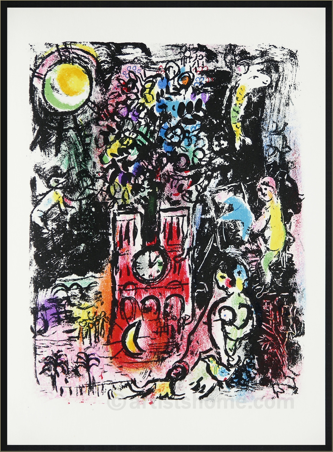Details:"The tree of Jesse" (L'arbre de Jessé) It must have been autumn when Marc Chagall was thinking about a picture that he would present in the pre-Christmas period of 1960. Instead of the familiar Christmas tree, he chose the tree of Jesse that is decorated with Christian symbols in some parts of the world during advent. It is considered as a symbol for the lineage of Christ. This is also the origin of the Christmas carol "Lo, How a Rose E’er blooming […] Of Jesse’s lineage coming". As one can expect from Chagall, however, this tree of Christ is not rooted in the earth as any other tree. Here the tree grows from between the two towers of Notre Dame into the nocturnal Paris sky, glowing in all kinds of colours like a grand firework display. It is surrounded by familiar symbols of Chagall’s: the fish (this time with a donkey head), the sun and the moon, the painter with his easel, a couple with a child and the great clock that he attached to "Our Lady of Paris" (Notre Dame). Chagall had to work on one lithographic limestone per colour.