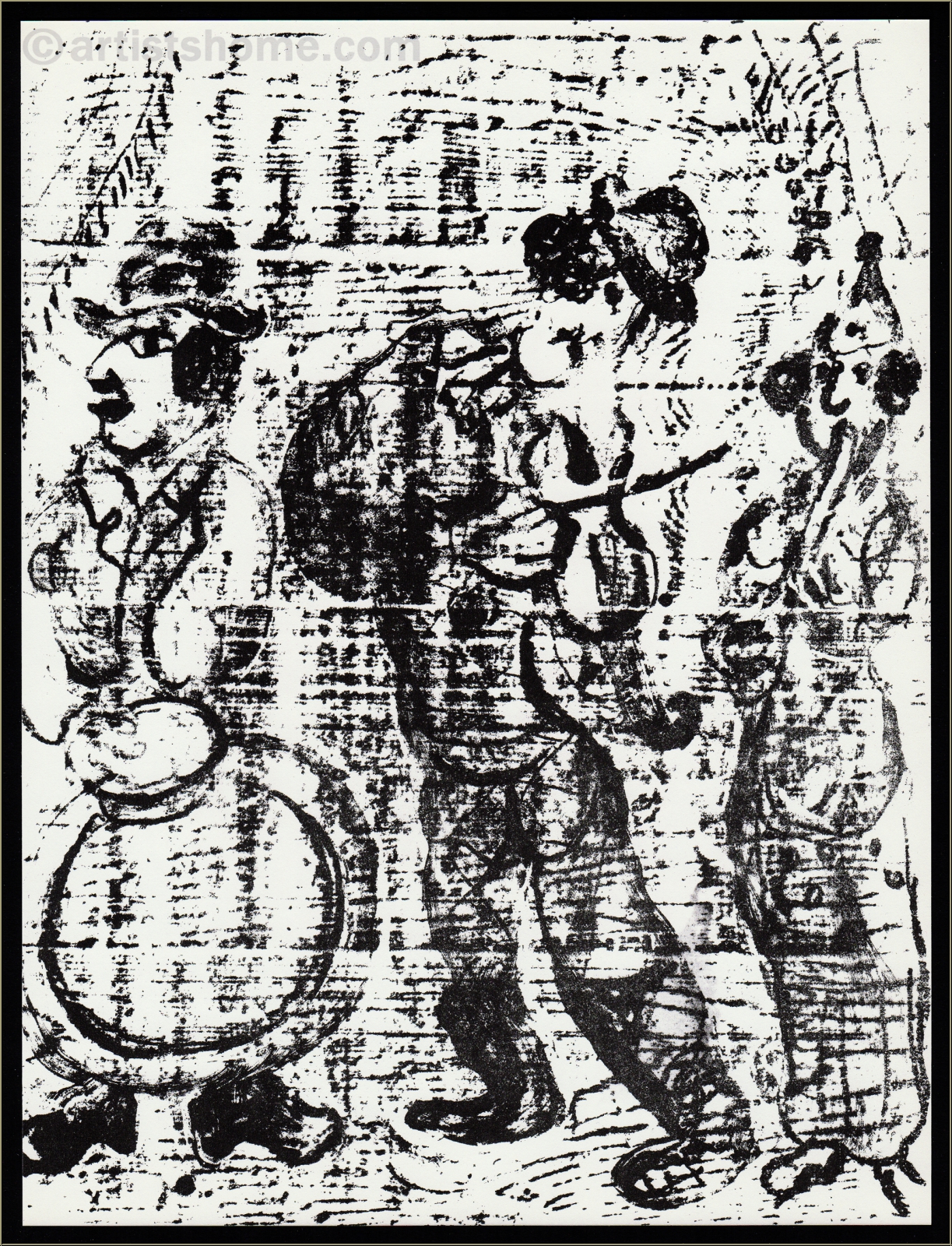 | | "The wandering musicians" - Les Musiciens Vagabonds | Technique: | Original lithograph "Les Musiciens Vagabonds" (Mourlot No 396) This is N O T a mass-produced photomechanical reprint but the original lithograph from the year 1963, exactly as referenced in Mourlots catalogue raisonné. | | Year: | 1963 | | Edition/Paper: | Offered here is one of the unsigned prints for the limited book edition on smooth velin paper. In addition, 150 copies on Arches wove paper with full margins were pulled and signed by the artist | | signed: | unsigned, as issued. | | Published by: | Éditions André Sauret, Monte-Carlo | | Printed by: | Mourlot, Paris | | Remarks: | Between 1960 and 1974 Marc Chagall created 28 full-page lithographs for the six authoritative volumes about his entire lithographic work. These original lithographs are not to be confused with photomechanically reproduced prints with the same motif. | Documentation/ References: | Mourlot, Fernand. Chagall Lithograph [III] 1962-1968, André Sauret, Monte Carlo, 1969, No. 396 Your print is being delivered with an abstract from the a.m. catalogue raisonné. In addition, you'll receive a proof of identity (without selling price in case this print is intended as a present). | | Condition: | Read more A well-preserved, fine copy from the archives. Frame not included in delivery. | | | Customer Reviews: This item has not been rated, yet. Customer ratings may only be submitted by customers who have bought this item and are logged in. Your name will, of course, be displayed anonymized (e.g., "Tom H., United Kingdom").  *Applies to deliveries to Germany paid via PayPal. In case of payment by bank transfer, delivery will take 1-3 days longer from the day of your banker�s order. Delivery times for other countries and information for estimating the day of delivery can be found here |