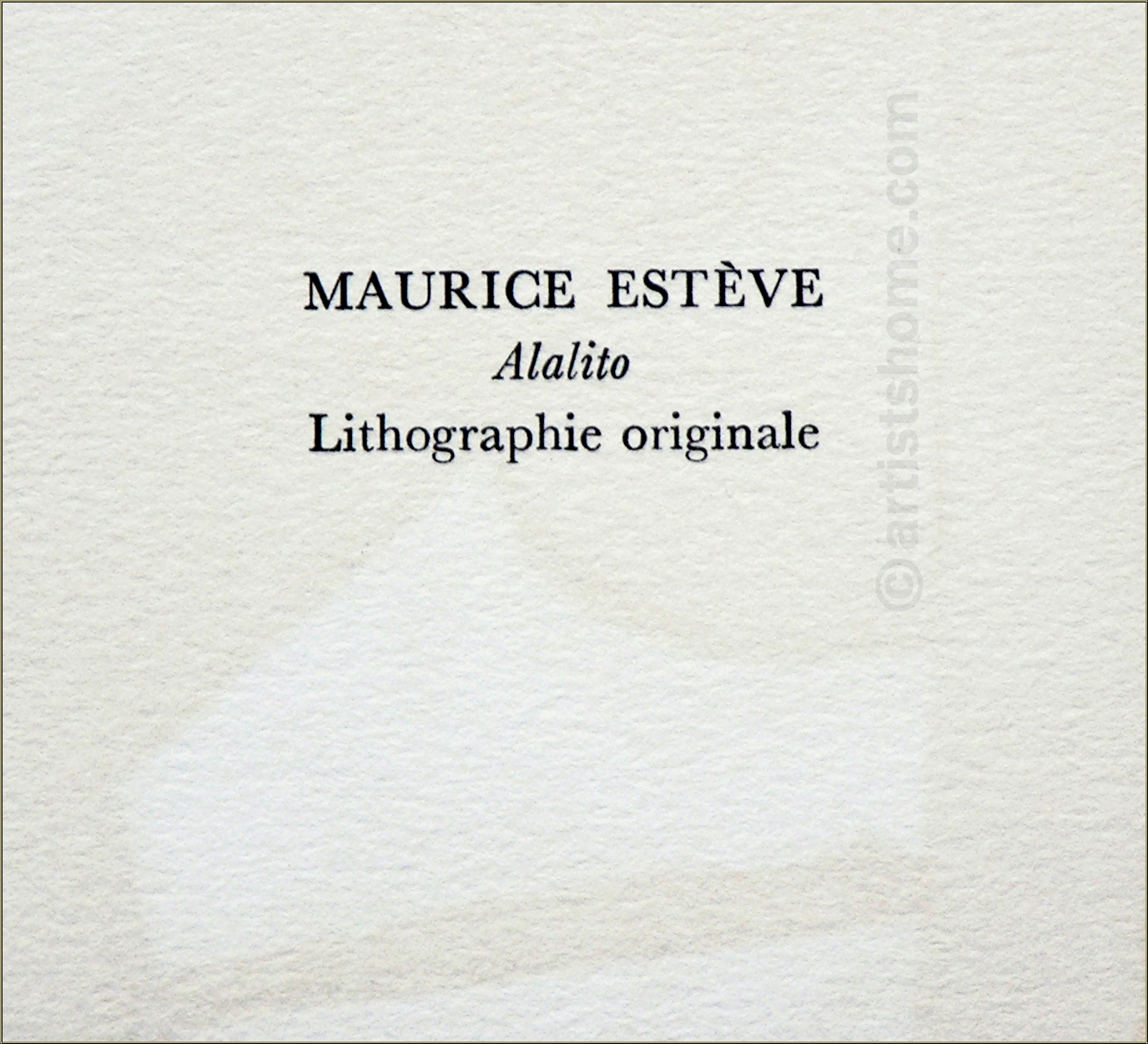 Edition | Paper: One of only 800 unsigned impressions on Arches laid paper. Text on the reverse: "Estève - Alalito - Lithographie originale"