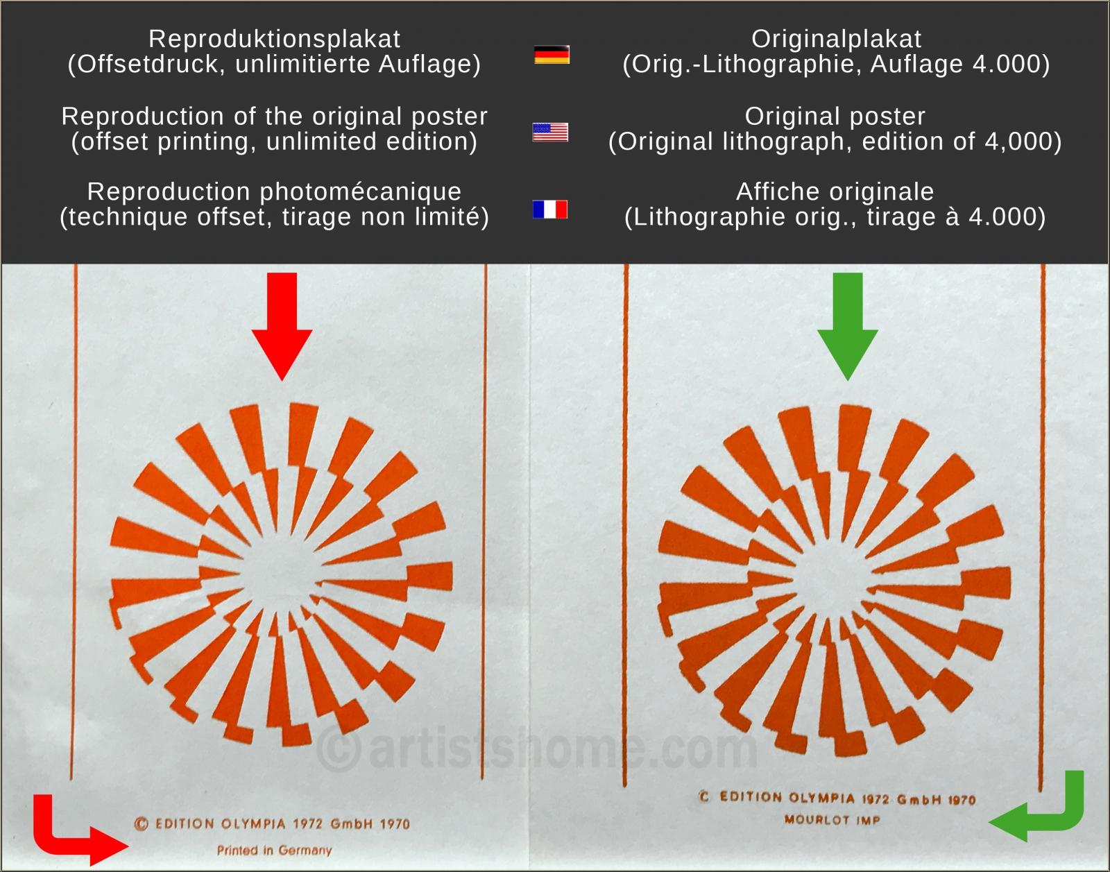 Original poster for the 1972 "Edition Olympia" featuring the original lithograph No. 29, identifiable by Mourlot's imprint right below the publisher's imprint. Posters with different imprints, e.g. "Printed in Germany" or "Printed in Germany for Kennedy Graphics, Inc." are offset reproductions of the original poster and NO original lithographs!