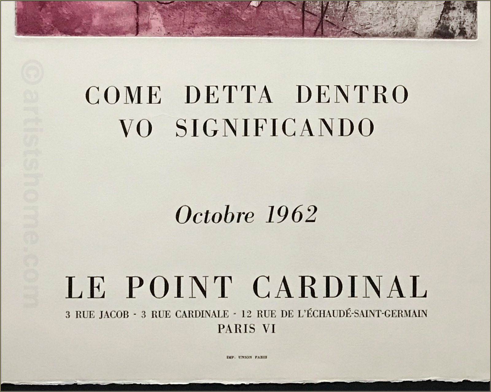 Details:"Matta - Come detta dentro vo significado", 1962 Original artists' poster from the year 1962, printed on Arches paper and featuring an elaborate etching in colors, created by Matta for the exhibition of "Come detta dentro vo significando" at the "Le Point Cardinal" Gallery in Paris.
