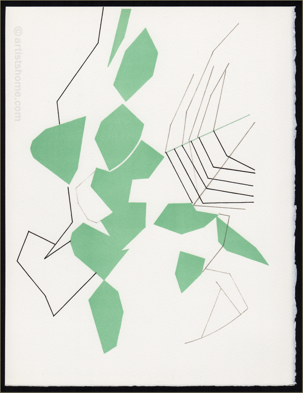 Abstract design with light green leaves and spider web on strong wove paper, printed in France