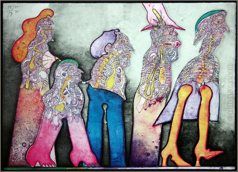 Details:"Frankfurter Umzug" (Move to Frankfurt), 1975 Typical work from Jaeger's "Human Zoo with all manor of creatures", who did not only cast off their clothes but also their skins - proudly presenting their insides to the viewer.