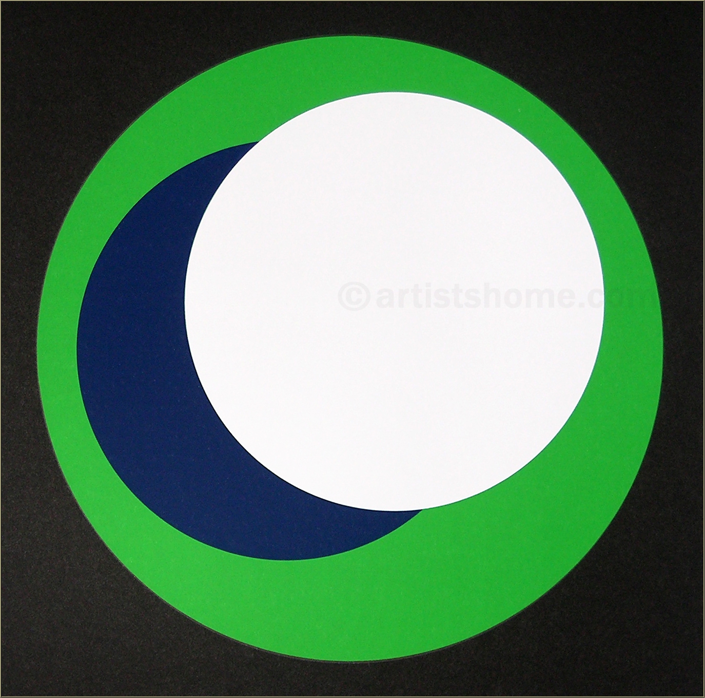 "Cercles" White, dark blue and green discs on black surface, 1967