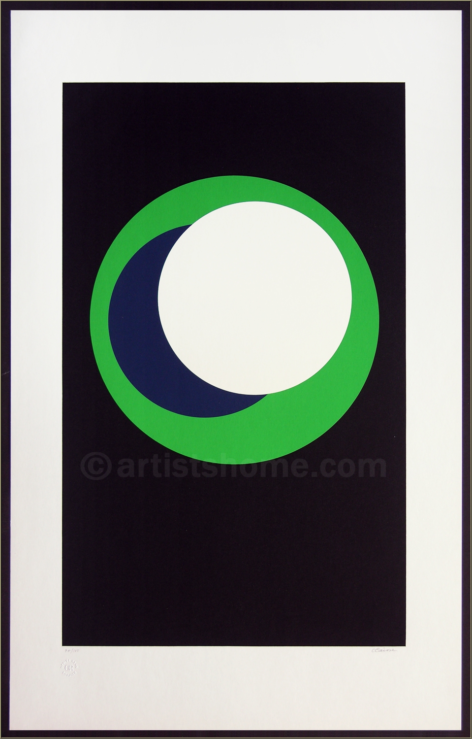 Geometric abstraction, Op-Art: Original serigraph "Circles" with plain-coloured discs on black background, signed