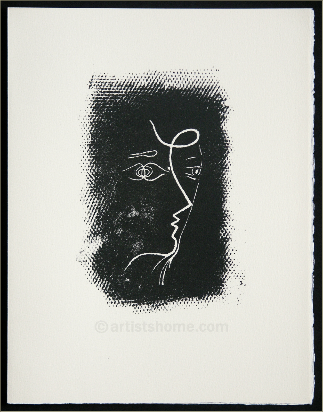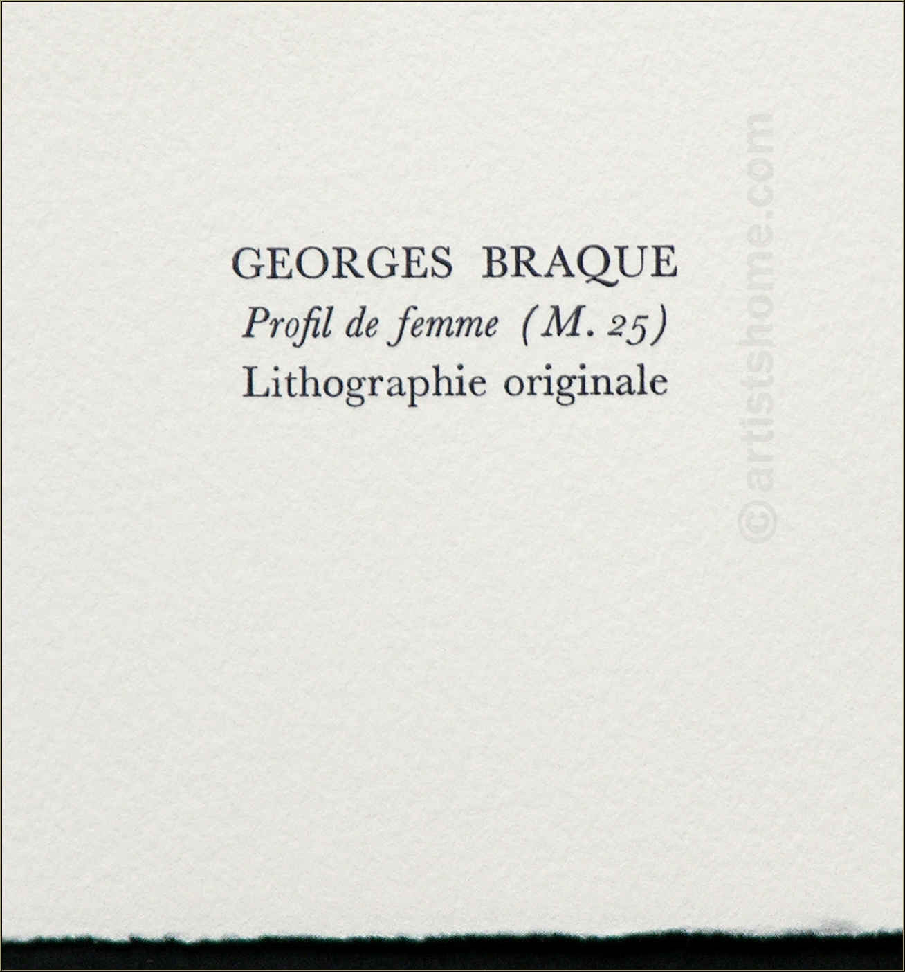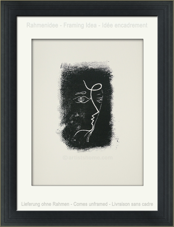 | | | Technique: | Original lithograph, printed by Mourlot This is N O T a mass-produced mere art print (e.g. photo or grano lithograph from a later "Limited edition") but the original lithograph for the collector's de luxe edition of the a.m. portfolio, exactly as referenced in Mourlots catalogue raisonné. WARNING: There are currently very similar-looking prints sold on the internet, at small prices. These are unauthorized reprints (pirated copies) an NO original lithographs! | | Year: | 1955 for the lithograph, 1972 for printing and publication. | | Remarks: | Text on the reverse: "Georges Braque - Profil de femme (M.25) - Lithographie originale". The catalogue raisonné states that this subject had been executed by Braque already in 1955 and is reserved for a specific book project to be pusblished soon. | | Sizes: | 32,5 x 25 cm / 12 ¾" x 10" (sheet) | | Edition | Paper: | One of only 800 unsigned impressions on cream-colored Arches laid paper | | Published by: | Alain C. Mazo, Paris u. Léon Amiel, New York, 1972 | | Printed by: | Mourlot Studios, Paris | | Documentation / References: | Mourlot, Fernand. Braque Lithographe. Sauret, André, Monte Carlo, 1963, pages 60-61, no 25. See also at https://mourlot.com: "Livres de Fernand Mourlot" Your print is being delivered with an abstract from the a.m. documentation for your files. In addition, you'll receive a proof of identity (without selling price) in case this print is intended as a present. | | Condition: | Read more A well-preserved, untouched impression from the archives. Frame not included in delivery. | Customer Reviews: This item has not been rated, yet. Customer ratings may only be submitted by customers who have bought this item and are logged in. Your name will, of course, be displayed anonymized (e.g., "Tom H., United Kingdom").  *Applies to deliveries to Germany paid via PayPal. In case of payment by bank transfer, delivery will take 1-3 days longer from the day of your banker�s order. Delivery times for other countries and information for estimating the day of delivery can be found here |