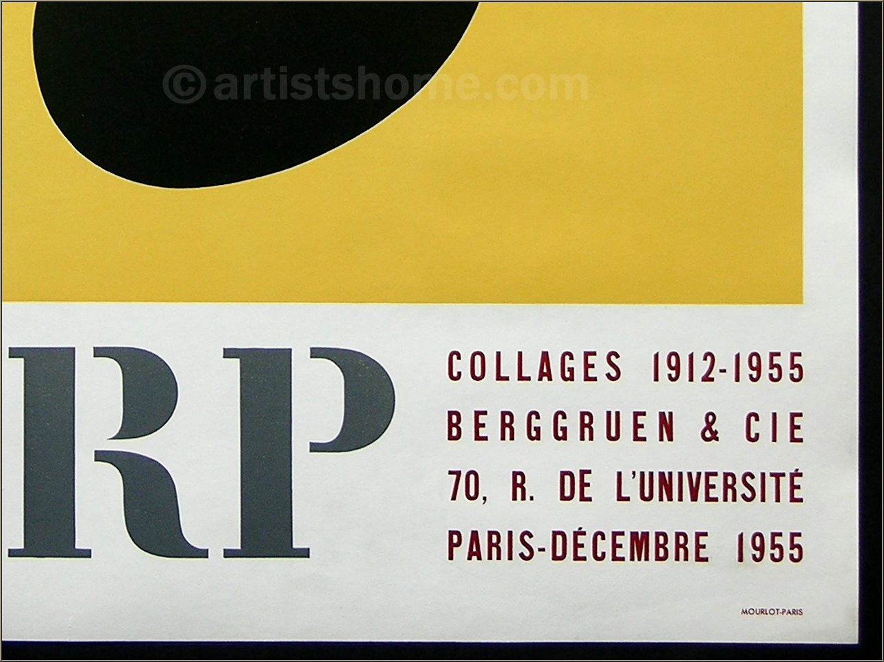 | | "Collages 1912 - 1955" Original poster for Jean Arp's exhibition at the Berggruen Gallery in Paris, 1955. Printed by Mourlot. | Medium / Technique: | Original exhibition poster from the year 1955 Lithograph "Presque vase et fleur" printed in colors | | Size: | 675 x 475 mm | | Edition / Paper: | unknown (small) edition size on standard paper. Rare! | | Published by: | Berggruen & Cie. Gallery, Paris | | Printer: | Mourlot, Paris | Documentation/ Reference: | - Wichmann, Hans u. Hufnagl, Florian. Künstlerplakate Frankreich/USA Zweite Hälfte 20. Jahrhundert, Birkhäuser Verlag Berlin, 1991, page 40 - Klippstein & Kornfeld. Hans Arp Graphik 1912-1959. Bern 1959, no. 73 - Arntz, Wilhelm F. Hans (Jean) Arp. Das graphische Werk 1912-1966. L´oeuvre gravé - The graphic work, Gertrud Arntz-Winter, Haag 1980, pages 260 and 272, no. 331c | | Condition: | Read more In true excellent condition. | Customer Reviews: This item has not been rated, yet. Customer ratings may only be submitted by customers who have bought this item and are logged in. Your name will, of course, be displayed anonymized (e.g., "Tom H., United Kingdom").  *Applies to deliveries to Germany paid via PayPal. In case of payment by bank transfer, delivery will take 1-3 days longer from the day of your banker�s order. Delivery times for other countries and information for estimating the day of delivery can be found here |