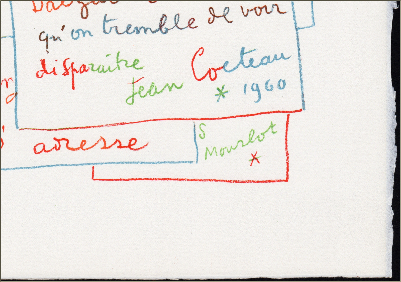 Edition | Paper: One of 800 unsigned impressions on Arches laid paper. Text on the reverse: "Jean Cocteau - Manuscrit - Lithographie originale"