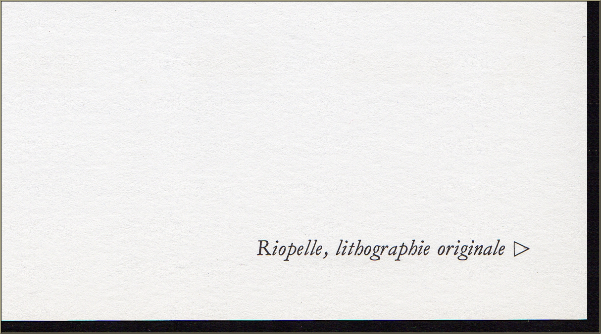 | | Original lithograph in colors by Canadian artist Jean-Paul Riopelle from the portfolio "Hommage à Aimé et Marguerite Maeght", published in 1982 as a retrospect on the occasion of Aimé Maeghts death. 24 of "their" artists contributed with original graphic works. | | Sizes: | 38 x 28 cm (sheet/image) | | Signed: | impression from the unsigned edition, published in 1982 | | Published by: | Maeght Gallery, Paris | | Remarks: | Text on the reverse, as published. The title "Riopelle, lithographie originale" is printed on the back of the previous page which will be supplied along with the lithograph. | Documentation/ References: | Maeght Éditeur. Derriere le miroir 1946-1982. Maeght, Paris, 1983, p. 110 | | Condition: | Read more A well-preserved impression. Comes unframed. | | Customer Reviews: This item has not been rated, yet. Customer ratings may only be submitted by customers who have bought this item and are logged in. Your name will, of course, be displayed anonymized (e.g., "Tom H., United Kingdom").  *Applies to deliveries to Germany paid via PayPal. In case of payment by bank transfer, delivery will take 1-3 days longer from the day of your banker�s order. Delivery times for other countries and information for estimating the day of delivery can be found here |