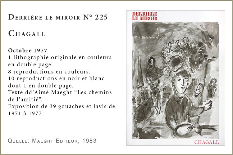 | | | Derriere le miroir (DLM) No. 225 "Chagall" - The complete portfolio with the large lithograph "The Village" (Le village). | | About Derrière le miroir: | In the postwar year 1946, Aimé and Marguerite Maeght, owners of the Galerie Maeght in Paris, embarked on a publishing venture: in search of a kind of "forum" for the discussion and distribution of original graphic work by "their" artists, the idea of Derriere le miroir was born. More... | | Details on this issue: | | The issue No. 225 was published in October 1977 and is the ninth of in total 11 monographic Derriere le miroir volumes with original graphic works by Marc Chagall. It attended the exhibition of 39 gouaches and drawings of Chagall in the premises of Maeght's gallery in Paris. With one large original lithograph by Marc Chagall: "The Village" [Mourlot No. 917], 38 x 56 cm plus another 18 large reproductions after Chagall 28 pages, loose sheets in the original wrappers Sheet size: 38 x 56 cm (double pages with centre fold) Copy size: 38 x 28 cm Paper: Velin Published by: Maeght, Paris Printed by: Mourlot, Paris (lithograph) Text: Aimé Maeght 1st original edition. | | Catalogue raisonné / Reference: | | Sorlier, Charles. Chagall Lithographe [V] 1974-1979. André Sauret, Monte-Carlo 1984, p. 150, No. 917 This issue is being delivered with an abstract from the a.m. catalogue of works (French text). | | Condition: | [X] Complete Read more A well-preserved copy! | Customer Reviews: This item has not been rated, yet. Customer ratings may only be submitted by customers who have bought this item and are logged in. Your name will, of course, be displayed anonymized (e.g., "Tom H., United Kingdom").  *Applies to deliveries to Germany paid via PayPal. In case of payment by bank transfer, delivery will take 1-3 days longer from the day of your banker�s order. Delivery times for other countries and information for estimating the day of delivery can be found here |
