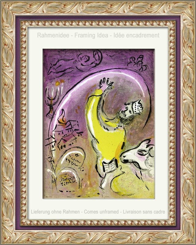 In 1956, the French art critic and publisher Tériade brought out a special issue of the legendary art magazine Verve, which was exclusively devoted to one of Marc Chagalls major themes: The Bible. For this outstanding issue, Chagall composed 18 full-page colour lithographs and 12 in black and white. For his "Bible I" Marc Chagall focused on characters from the Old Testament such as the Founding Fathers, the Kings, the Prophets and Angels. Four years later, in 1960, the follow-up issue "Illustrations for The Bible" was published, with another 24 gorgeous color lithographs. Since then, vast numbers of reproductions were put in circulation which are anything but original(!) lithographs.