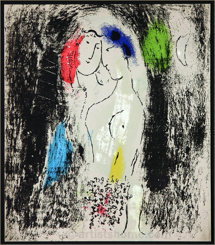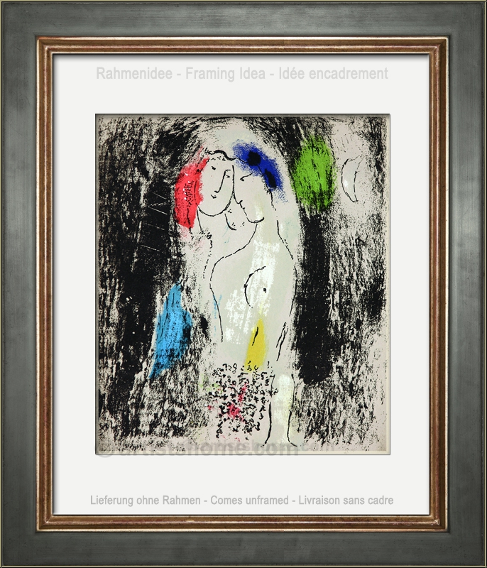 | | "Lovers in grey / Les Amoureux en gris" Tenderness and trust seem to bind this couple together, who are lost in thought in the middle of darkness. Everything else surrounding them is faded out in order to intensify the significance of this intimate moment. This genuine limited edition print is one of several love scenes that Marc Chagall created for the important volume about his life until 1957, written by J. Lassaigne. Hence the monograph also became a biography. | Technique: | Original lithograph in colours (Mourlot no. 194) This is N O T a mass-produced reprint (photomechanical reproduction) but the original lithograph from the first edition of the monograph "Chagall" by J. Lassaigne, exactly as referenced in Mourlots catalogue raisonné. Note: there are lots of reproduced plates from a later piracy reprint edition that are no original lithographs! | | Year: | 1957 | | Sizes: | 23 x 20 cm / 9" x 7.9" (sheet) | | Edition | Paper: | One of 6000 unsigned impressions from the book edition on smooth velin paper. In addition, 90 pencil-signed and numbered impressions on Arches wove paper with wide margins were published. | | Published by: | Maeght Editions, Paris | | Printed by: | Mourlot, Paris | | Documentation / References: | Mourlot, Fernand. Chagall Lithograph [II] 1957-1962, André Sauret, Monte-Carlo 1963, pages 20-29, no. 194 Your print is being delivered with an abstract from the a.m. catalogue raisonné for your files. In addition, you'll receive a proof of identity (without selling price) in case this print is intended as a present. | | Condition: | Read more In very good condition. Frame not included in delivery. | Customer Reviews: This item has not been rated, yet. Customer ratings may only be submitted by customers who have bought this item and are logged in. Your name will, of course, be displayed anonymized (e.g., "Tom H., United Kingdom").  *Applies to deliveries to Germany paid via PayPal. In case of payment by bank transfer, delivery will take 1-3 days longer from the day of your banker�s order. Delivery times for other countries and information for estimating the day of delivery can be found here |