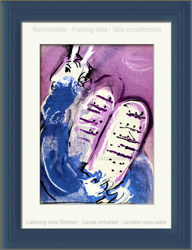 Moses is one of the most important personalities in the history of the Jewish people. Chagall dealt with the story of Moses several times and the prophet inspired many of his artworks. Commissioned by God, Moses had the difficult task of leading the people of Israel out of slavery in Egypt to freedom. In the Sinai desert, he eventually received the Ten Commandments from God. In the Jewish tradition, the Ten Commandment are considered directives. “If you love God, you will not steal, lie or commit adultery”.