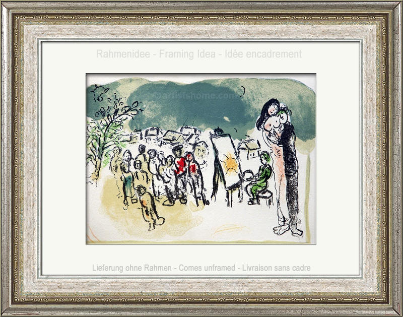 Details:"Hommage à Julien Cain" Chagall chose a small countryside village as the setting for this tender love scene. The villagers watch a painter at work. Chagall, who mostly portrayed himself with curly hair, has probably portrayed himself twice in this work: as a well-known artist attracting public interest and as an affectionate lover and admirer of women - most of all, his first wife Bella. Chagall has put this very private scene at the rightmost end of the picture. It is taking place separated from the commotion surrounding his person. Julien Cain, to whom this work is dedicated, was a close friend and artistic companion of Chagall’s for many years. He wrote, among other things, two of the six volumes comprising the catalogue raisonné of Chagall’s graphic work.