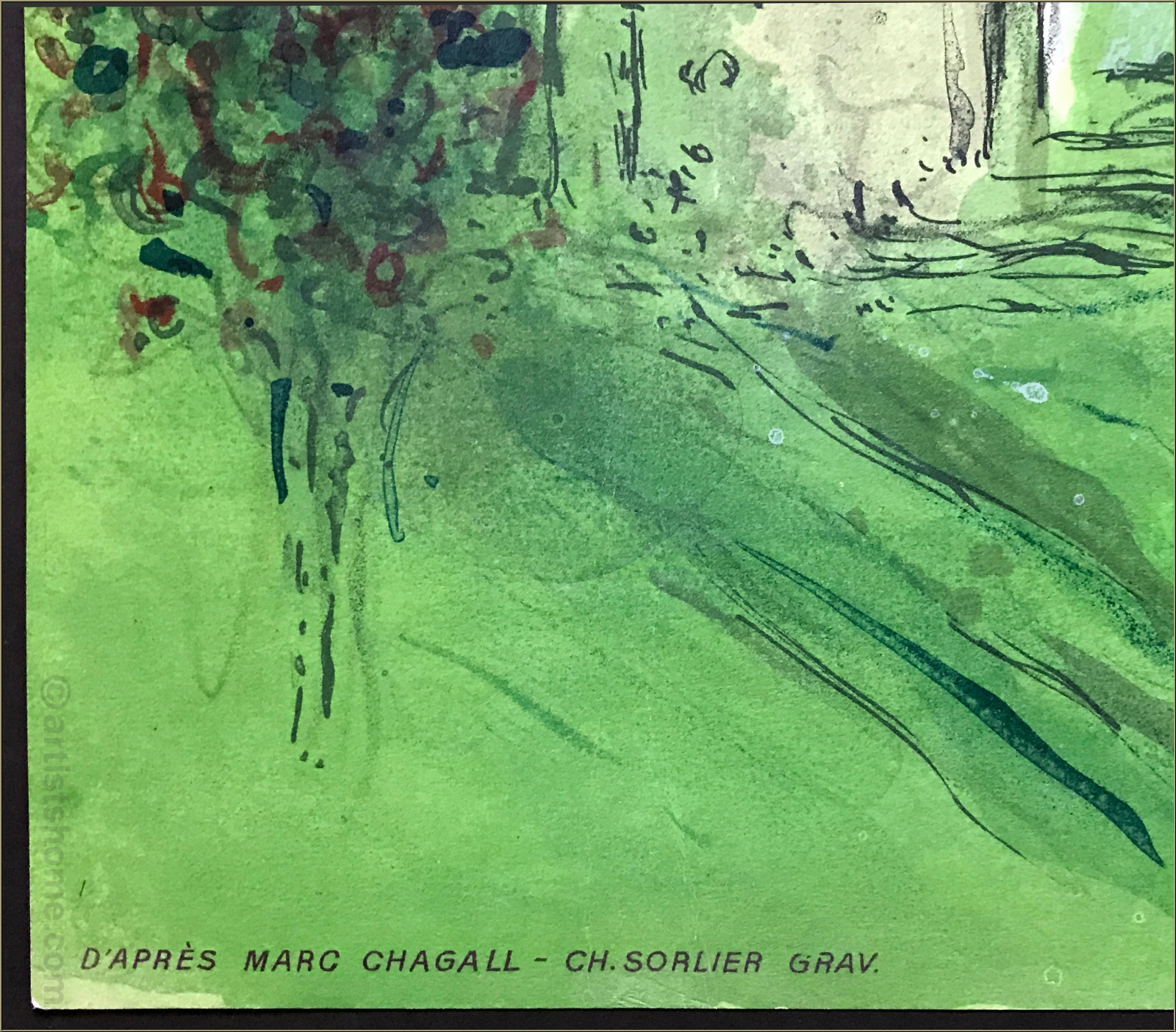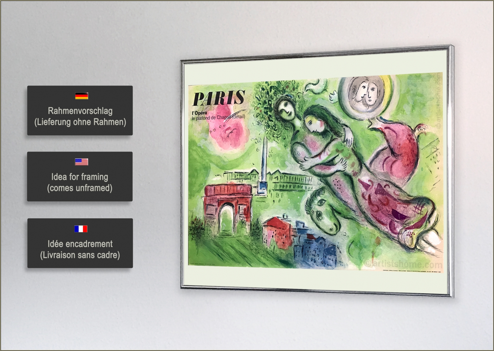 Details:"Romeo and Juliet" Paris l'Opéra, le plafond de Chagall (1964) Original poster ("Roméo et Juliette") published by and for the French Government to promote the Paris Opera as well as other Parisian sights such as the Place de la Concorde and the Arc de Triomphe. Executed by Charles Sorlier, senior lithographer at the Mourlot studios in Paris, after a detail of Chagall's Ceiling of the Opera.
