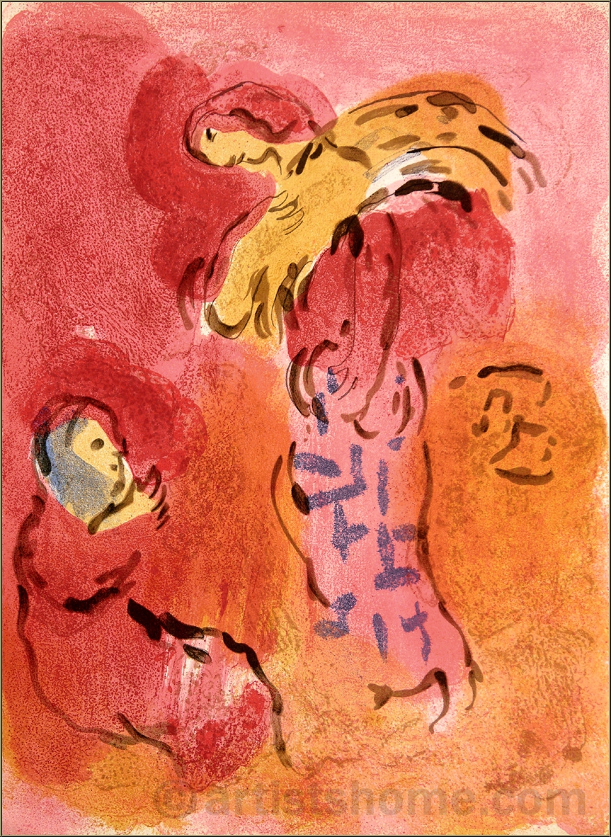 This is N O T a mass-produced reprint (photomechanical reproduction such as offset lithographs or giclée prints) but the original lithograph from Chagall's Bible II, exactly as referenced in Mourlots catalogue raisonné.