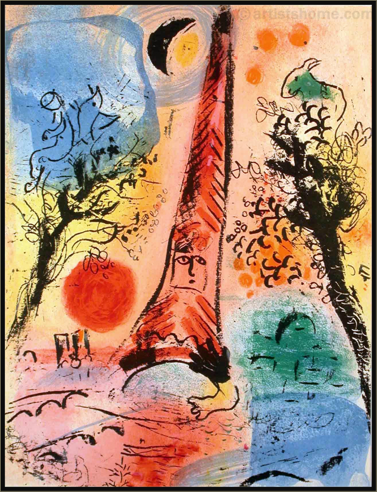 Details:"Vision de Paris" "For my art, I needed Paris as necessary as a tree does need water", Chagall used to say when he was asked about the reasons for the departure from his native Russia. He seemed to suffocate by the silence, sadness and lack of color, which his hometown and family environment must have radiated at that time. Paris became Chagall's second home, it represented for him the longed-for freedom and versatility. Not surprising, then, that Chagall's Paris pictures always included a firework of colors. The colorful vitality of this vibrant city must have impressed him greatly, as reflected also in this image, underlined by the remarkable choice of colors - who else except Chagall would probably get the idea, to combine a soft pink with bright orange? With its typical symbolism this print is certainly among the most magnificent and most colorful lithographic works by the artist.