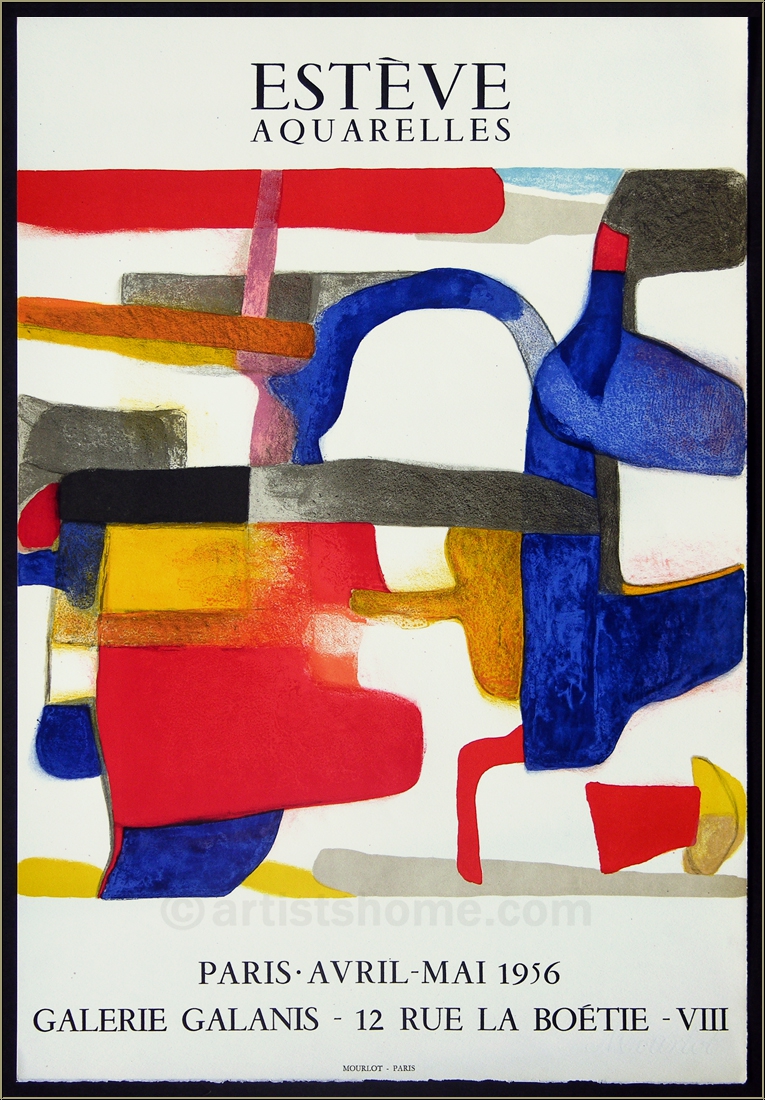Vintage poster with an original lithograph in colors, created by Estève to advertise his exhibition of watercolors at the Galanis Gallery in Paris. This is the second of only 10 posters in total, featuring original graphics by the artist.