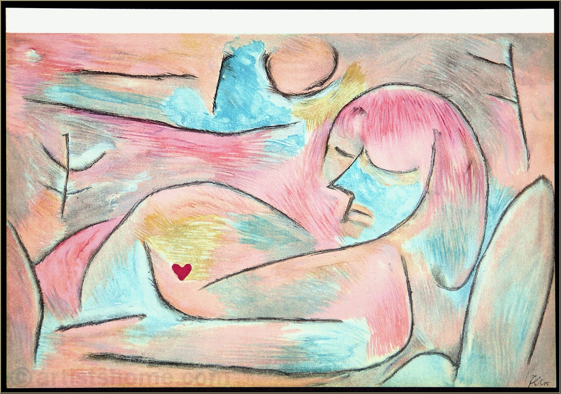 Details:"Sommeil d'hiver" (Hibernation) For this winterly work, Klee chose cool, but also warming pastel shades. For him, winter is obviously more than frost, coldness and frozen nature, and also a time of hidden becoming, of inner growing-up. There is a woman who seems to be sleeping, and her belly is curved. A small heart, drawn in a strong red, explains the curved belly. She is pregnant, a new life is growing inside her that she will, like a bear, give birth to in spring. This lithograph with the subject of "winter" was Paul Klee’s contribution to the art magazine Verve from 1938, published by Tériade, in which three other famous painters artistically represented the remaining seasons.