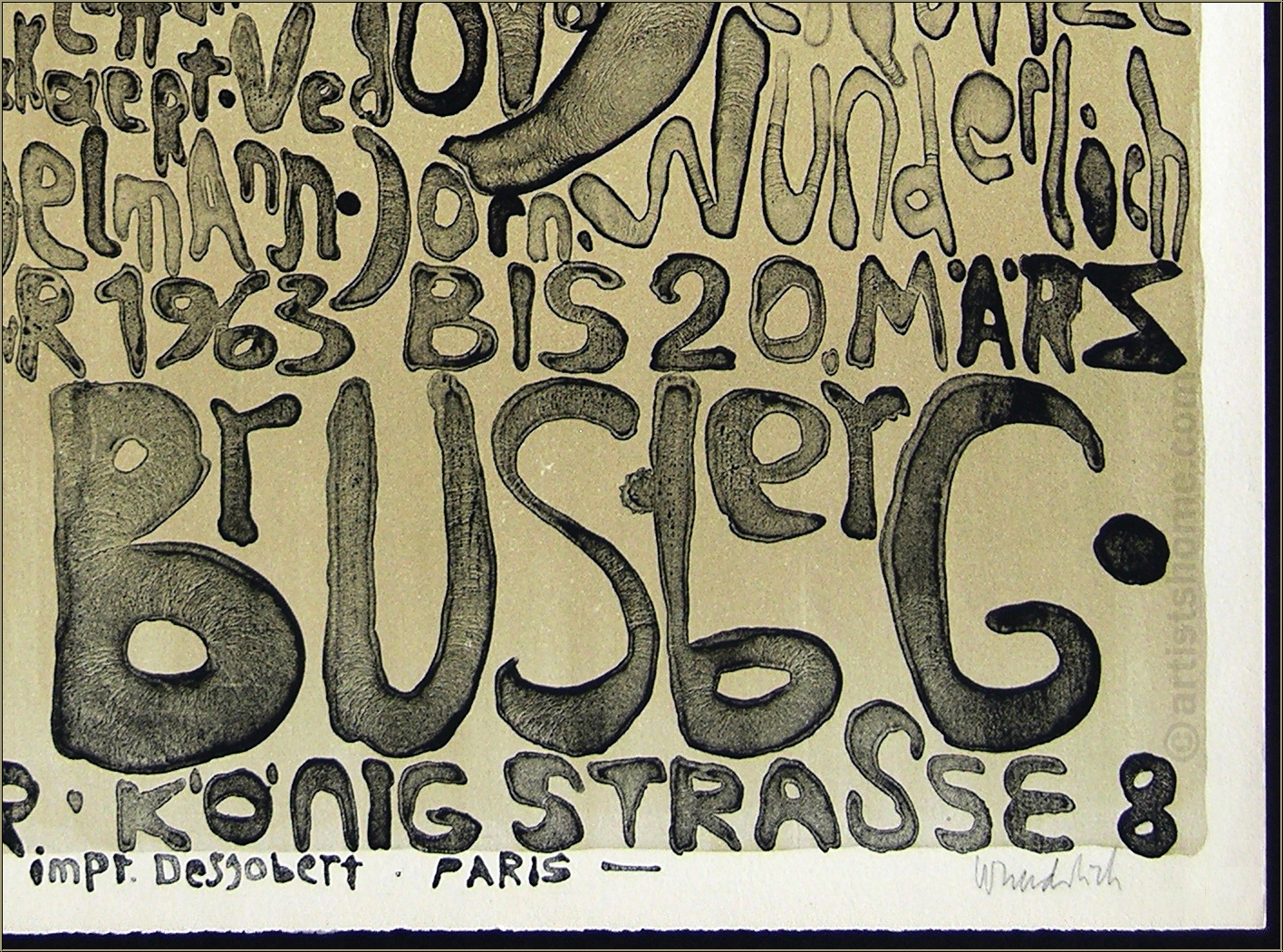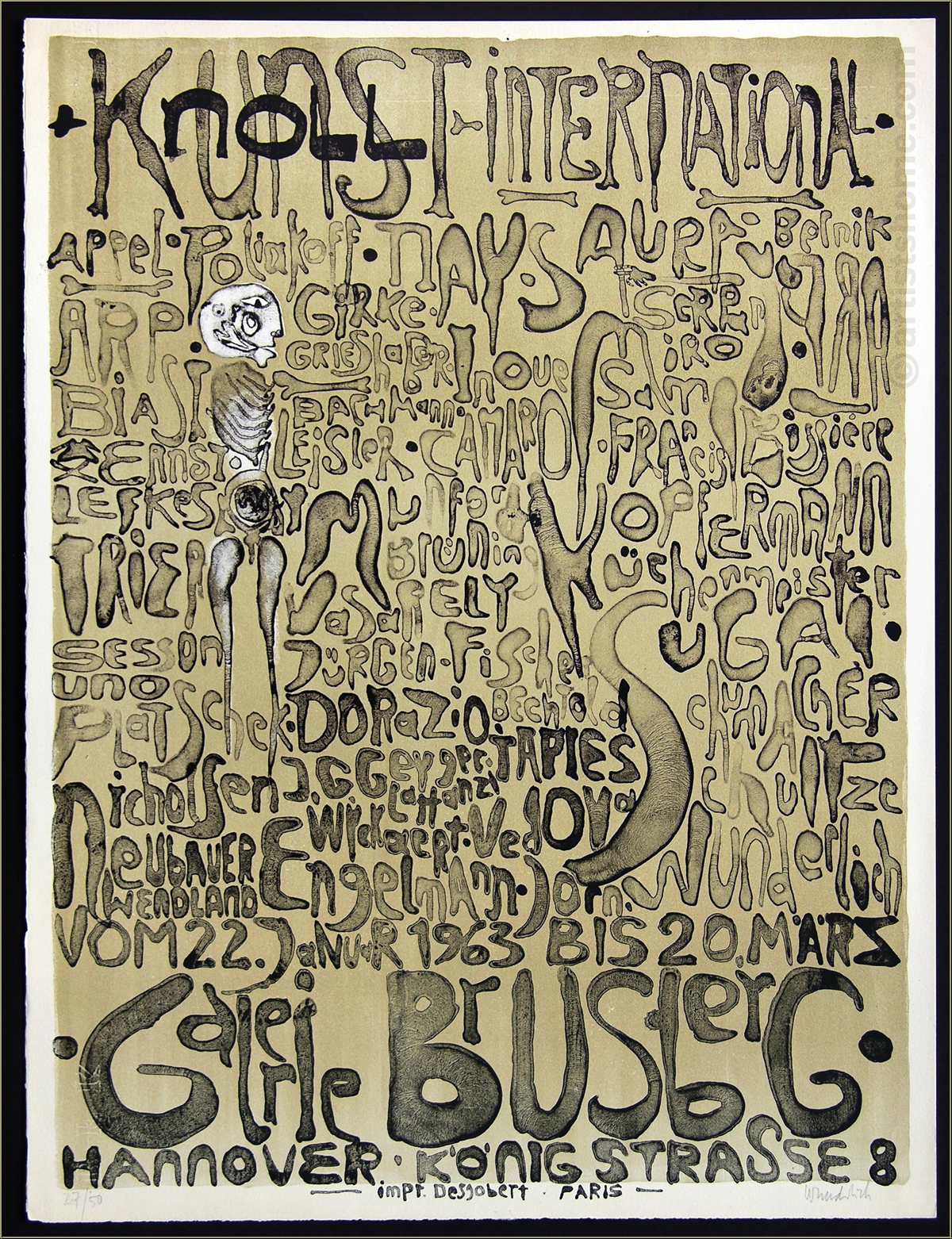 | | "Kunst + Knoll International" - 1963 | Medium / Technique: | Exhibition poster for the 1963 KNOLL Art show at Brusberg Gallery in Hanover. Original lithograph printed in two colors | | Size: | 69 x 52 cm / 27 ¼ x 20 ½ in. | | Edition / Paper: | One of only 50 impressions on wove paper, signed and numbered in pencil by Wunderlich, printed on watermarked BFK Rives paper | | Printer: | Desjobert, Paris | Documentation/ Reference: | Riediger, Carsten. Paul Wunderlich. Werkverzeichnis der Druckgraphik 1948-1982, Edition Volker Huber, Offenbach, 1983, page 128, No 224 This print is being delivered with a copy from the a.m. catalogue (in German). | | Condition: | Read more In excellent condition! | Customer Reviews: This item has not been rated, yet. Customer ratings may only be submitted by customers who have bought this item and are logged in. Your name will, of course, be displayed anonymized (e.g., "Tom H., United Kingdom").  *Applies to deliveries to Germany paid via PayPal. In case of payment by bank transfer, delivery will take 1-3 days longer from the day of your banker�s order. Delivery times for other countries and information for estimating the day of delivery can be found here |