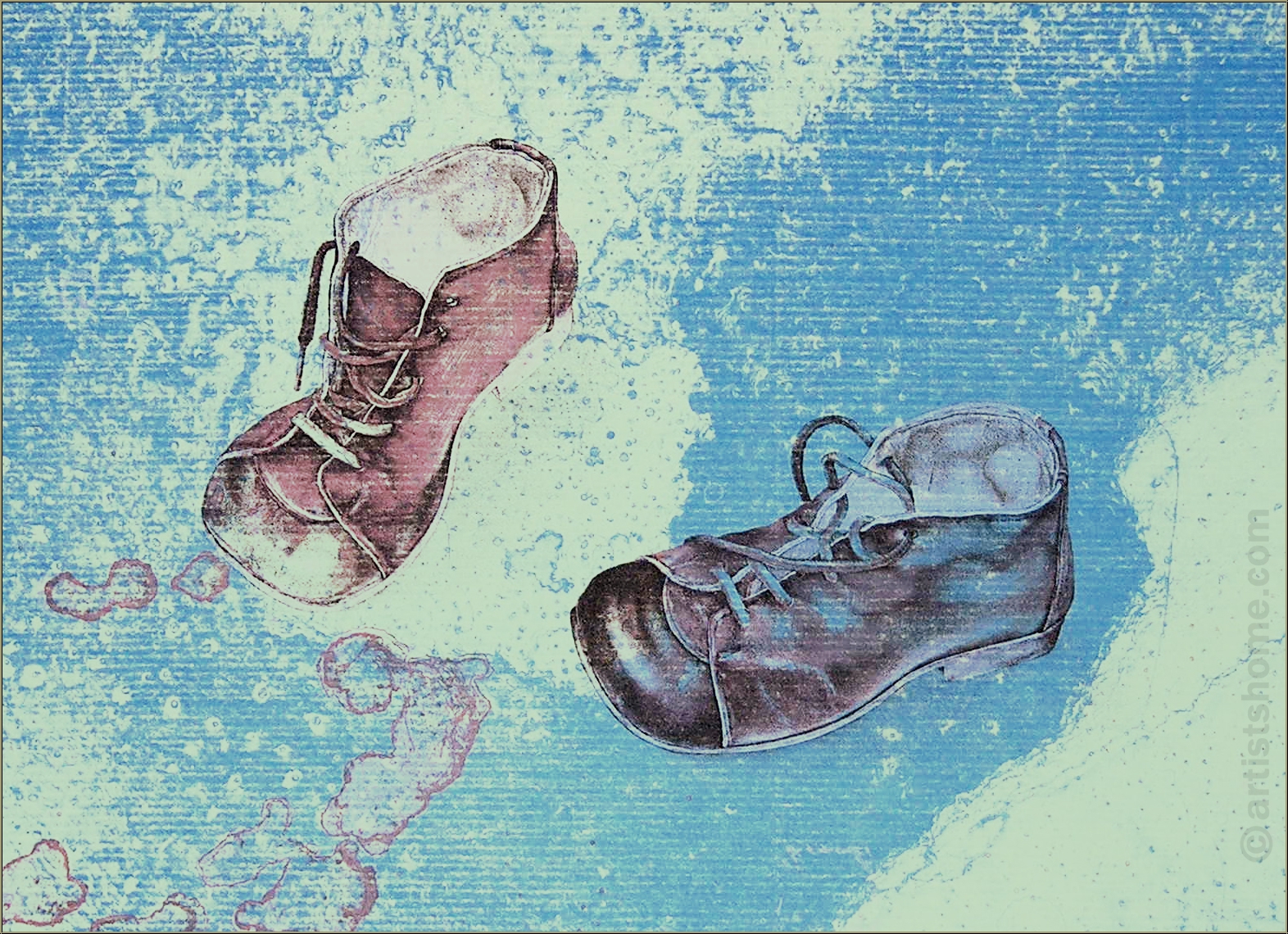 "Kinderspiel" - Pair of brown child's shoes on blue, printed on pale green handmade paper