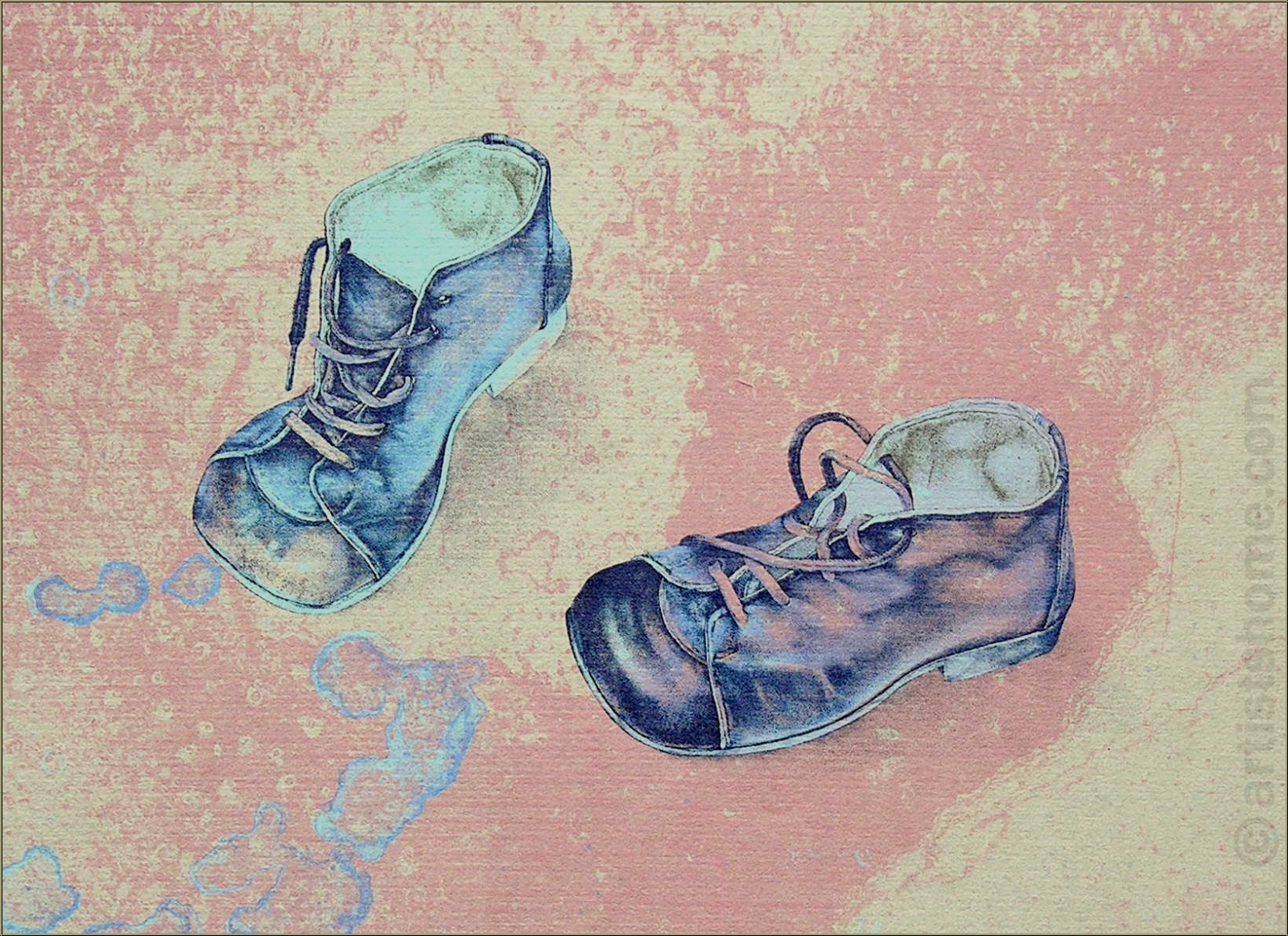 "Kinderspiel" - Pair of blue child's shoes on rose, printed on pastel brown handmade paper