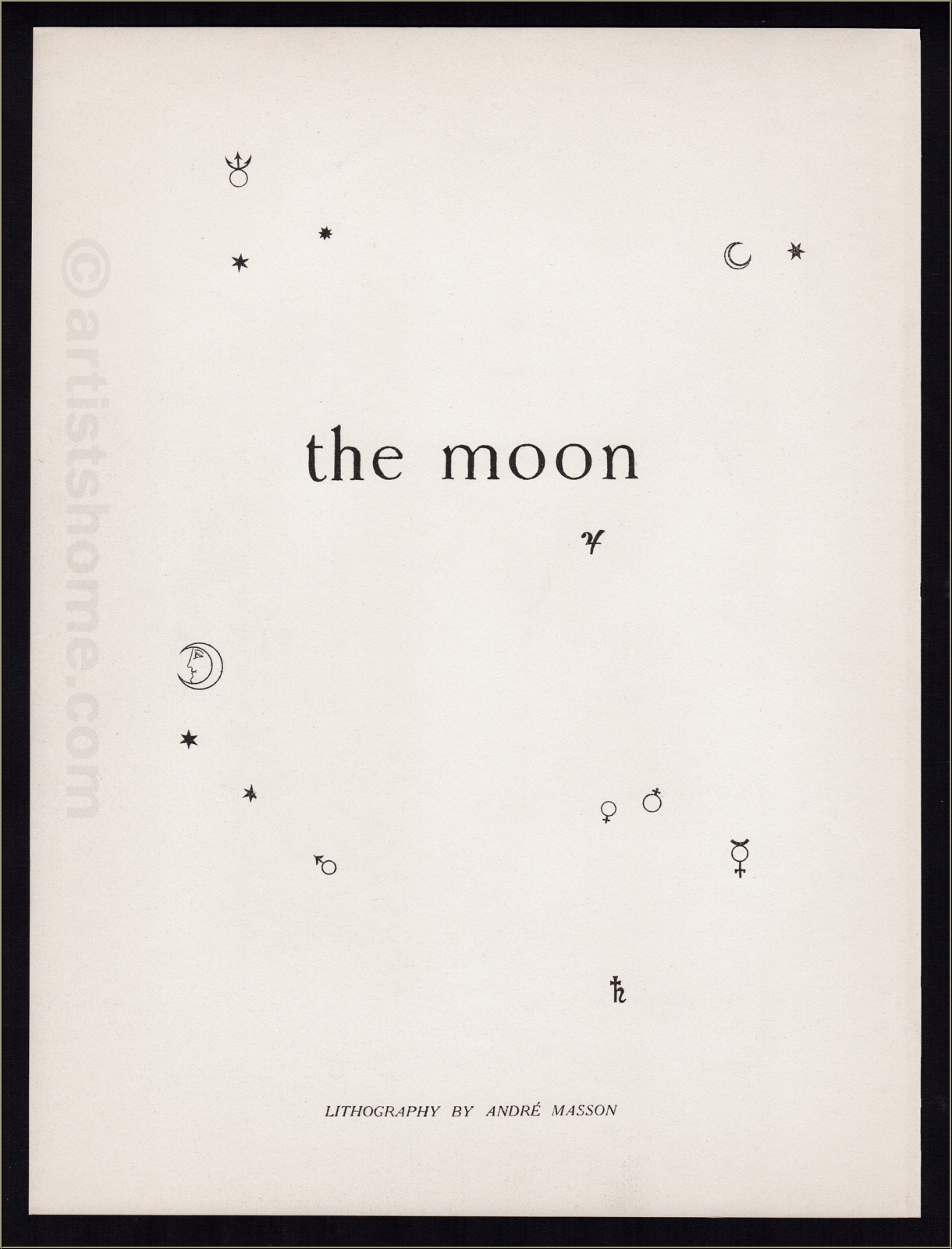 | | "The Moon" (La lune) - 1938 A snow-clad, one-eyed moon with horns - Surreal composition on the theme of celestial bodies for the French art periodical Verve, published in 1938 on the eve of the Second World War. | Technique: | Lithograph in colors, signed "André Masson" on the stone This is N O T a mass-produced photomechanical reprint but the lithograph for the 1938 issue of the French art magaine "Verve"! | | Year: | 1938 | | Sizes: | 35 x 25 cm / 13 ¾ x 10 in. (sheet) | | Edition | Paper: | One of approx. 2000 unsigned impressions for the book edition on smooth velin paper. | | Published by: | Tériade, Paris | | Printed by: | Mourlot Frères, Paris | | Remarks: | Text on the reverse, as published in 1938, either the english title "The Moon" as well as "Lithography by André Masson" or, for the French edition, "lune" as well as "Lithographie par André Masson" (see last picture) | | Documentation / References: | Anthonioz, M., Verve. The Ultimate Review of Art and Literature (1937-1960), Abrams, N.Y., 1988, pages 55-56 and 387 Your print is being delivered with an abstract from the a.m. documentation. In addition, you'll receive a proof of identity (without selling price) in case this print is intended as a present. | | Condition: | Read more An untouched copy from the archives. Rare, in this condition! | Customer Reviews: This item has not been rated, yet. Customer ratings may only be submitted by customers who have bought this item and are logged in. Your name will, of course, be displayed anonymized (e.g., "Tom H., United Kingdom").  *Applies to deliveries to Germany paid via PayPal. In case of payment by bank transfer, delivery will take 1-3 days longer from the day of your banker�s order. Delivery times for other countries and information for estimating the day of delivery can be found here |