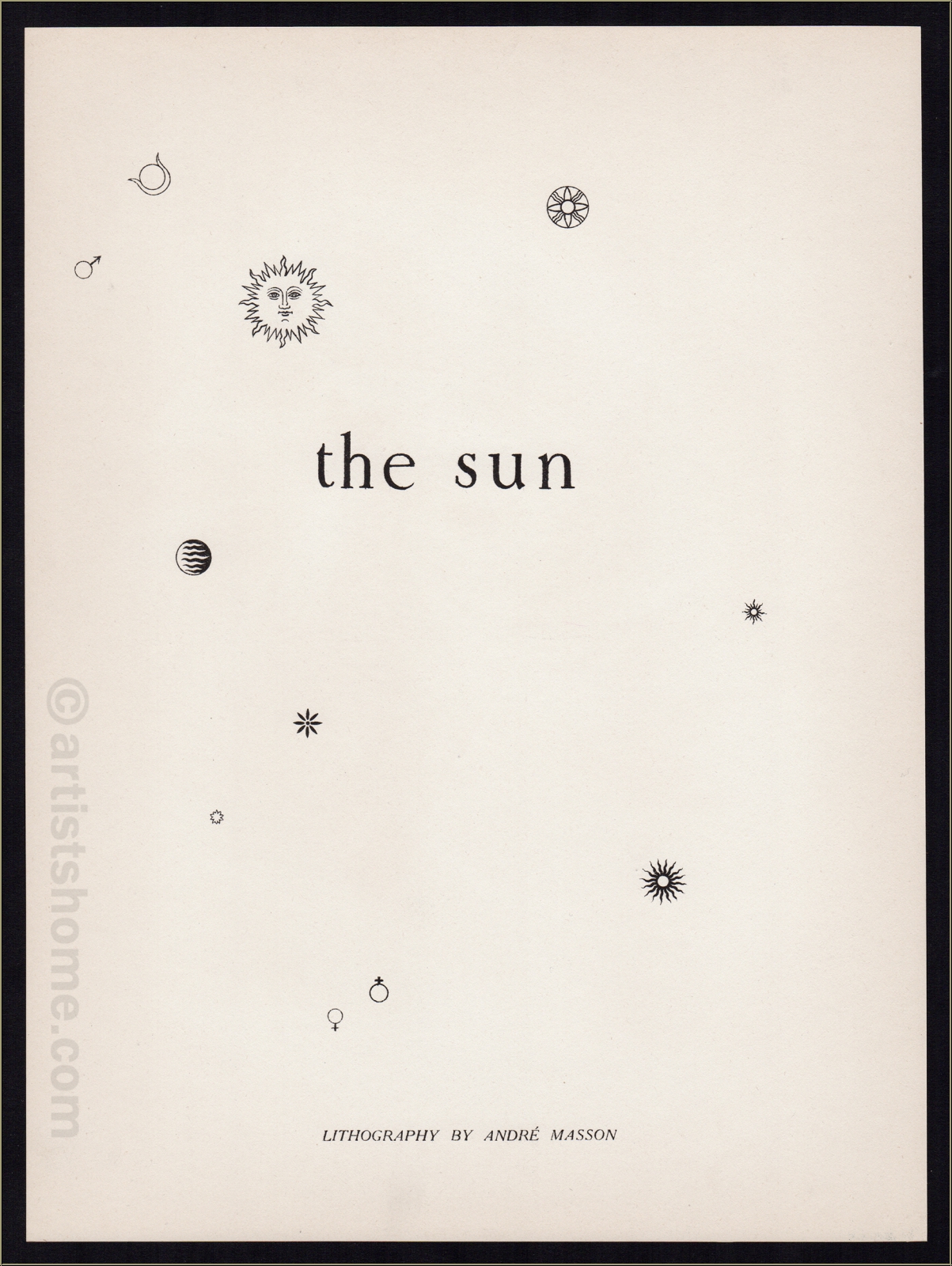 | | "The Sun" (Le soleil) - 1938 Surreal, abstract composition on the theme of celestial bodies for the second issue of the French avant-garde art magazine Verve, published in 1938 on the eve of the Second World War. | Technique: | Lithograph in colors, signed "André Masson" on the stone This is N O T a mass-produced photomechanical reprint but the lithograph for the 1938 issue of the French art magaine "Verve"! | | Year: | 1938 | | Sizes: | 35 x 25 cm / 13 ¾ x 10 in. (sheet) | | Edition | Paper: | One of approx. 2000 unsigned impressions for the book edition on smooth velin paper. | | Published by: | Tériade, Paris | | Printed by: | Mourlot Frères, Paris | | Remarks: | Text on the reverse, as published in 1938, either the english title "The Sun" as well as "Lithography by André Masson" or, for the French edition, "Soleil" and "Lithographie par André Masson" (see last picture) | | Documentation / References: | Anthonioz, M., Verve. The Ultimate Review of Art and Literature (1937-1960), Abrams, N.Y., 1988, pages 55-56 and 387 Your print is being delivered with an abstract from the a.m. documentation. In addition, you'll receive a proof of identity (without selling price) in case this print is intended as a present. | | Condition: | Read more An untouched copy from the archives. Rare, in this condition! | Customer Reviews: This item has not been rated, yet. Customer ratings may only be submitted by customers who have bought this item and are logged in. Your name will, of course, be displayed anonymized (e.g., "Tom H., United Kingdom").  *Applies to deliveries to Germany paid via PayPal. In case of payment by bank transfer, delivery will take 1-3 days longer from the day of your banker�s order. Delivery times for other countries and information for estimating the day of delivery can be found here |