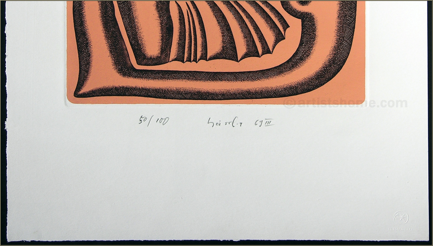 Details:"Figura terracotta" Two people sit opposite each other, eyes locked, behind a strangely shaped, round mug. Below them, a small, lying figure can be seen in the foreground. Countless fine lines create soft contours that can, at the same time, be clearly distinguished from the terracotta-coloured background. The work exhibits harmony as well as formal and mental sober-mindedness, intensified by the warm colour of fired clay.