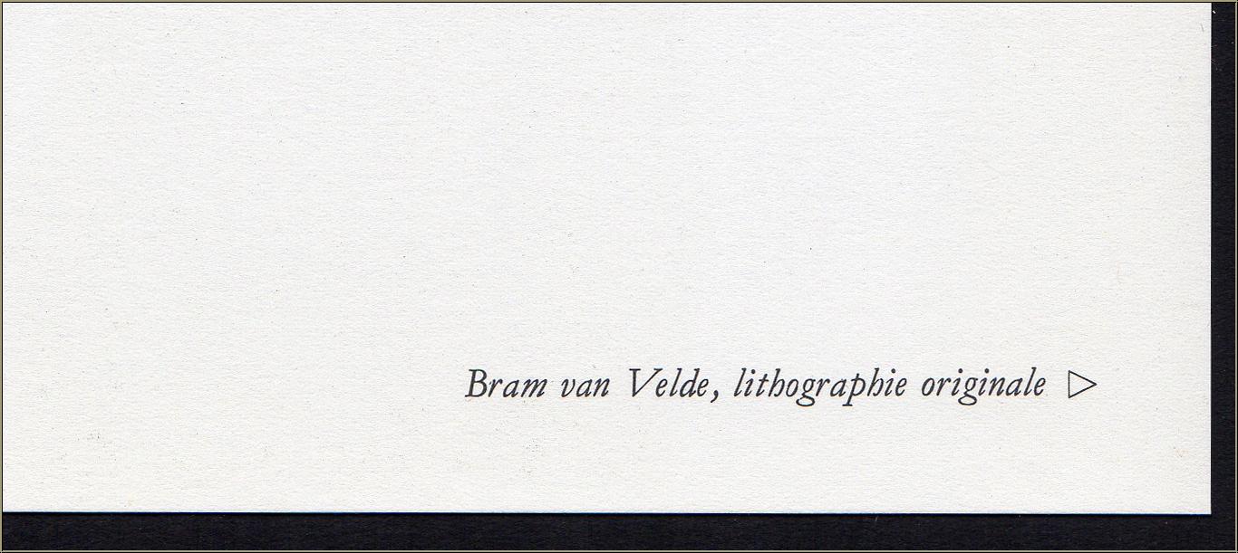 Text on the reverse (int.al.: "Bram van Velde, lithographie originale"), with the typical central fold and a few tiny holes from thread binding, as published.